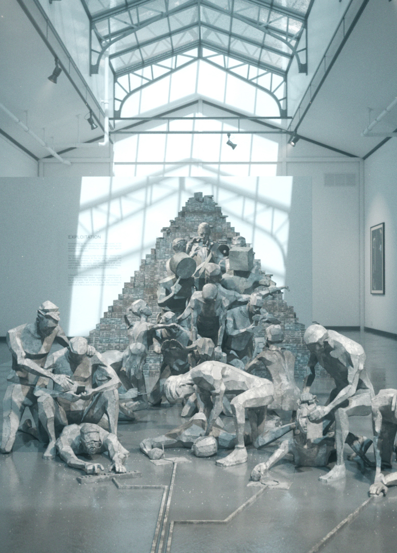 Três vídeos, todos em CG, formam um tríptico que apresenta instalações de faz de conta. Esta peça brinca com o conceito das fronteiras evanescentes entre meios tradicionais e digitais. Ela age como uma imitação enganosa, que tacitamente envolve um escultor ficcional, retratando uma crítica social por meio de uma estética brutalista. Nós seguimos suas exposições em armazéns industriais e galerias de arte, conforme seu ofício vai ganhando mais força.