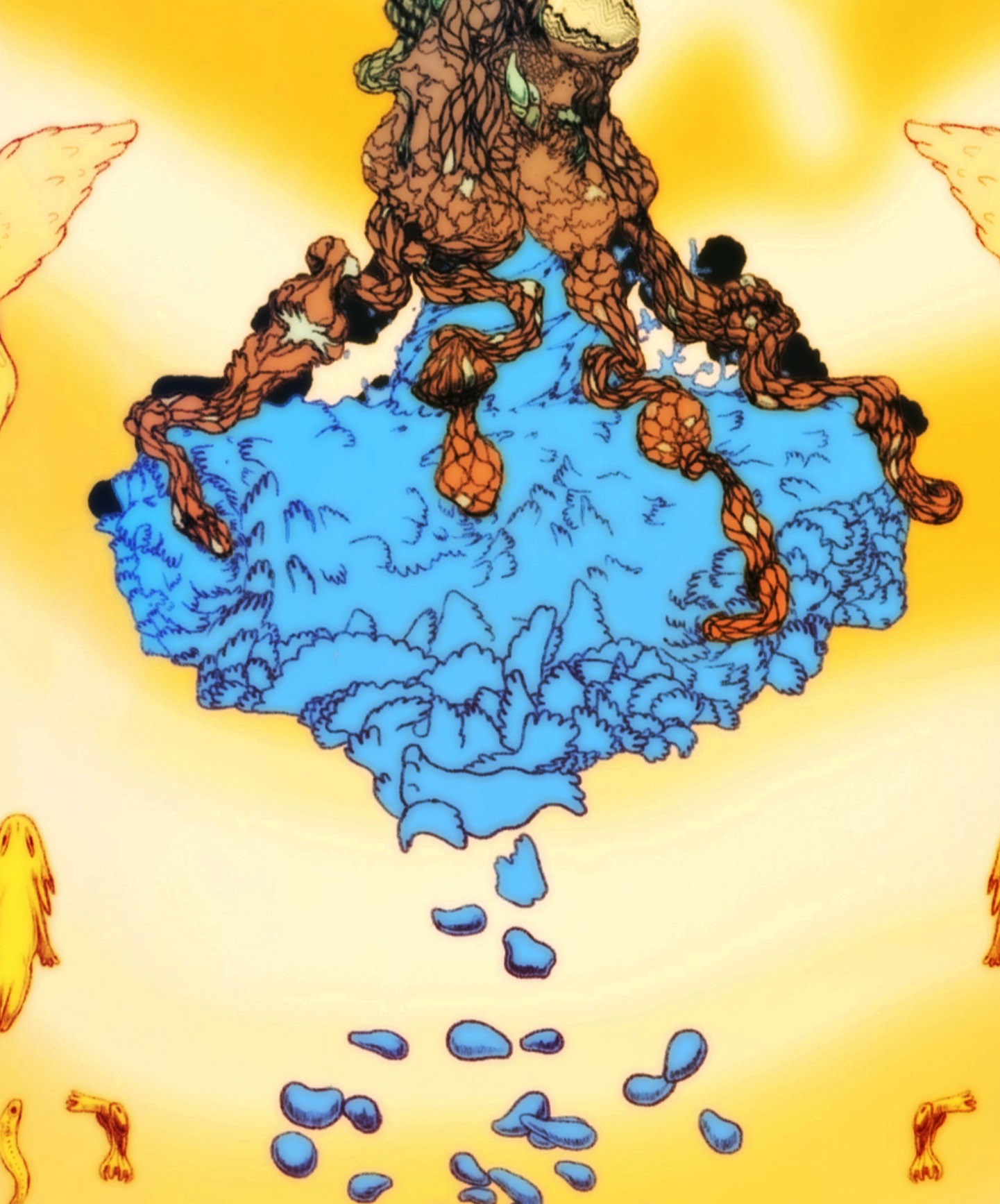 Figuras abstratas e coloridas que remetem a uma mandala em movimento, gerando outras formas como animais e outras formas orgânicas.