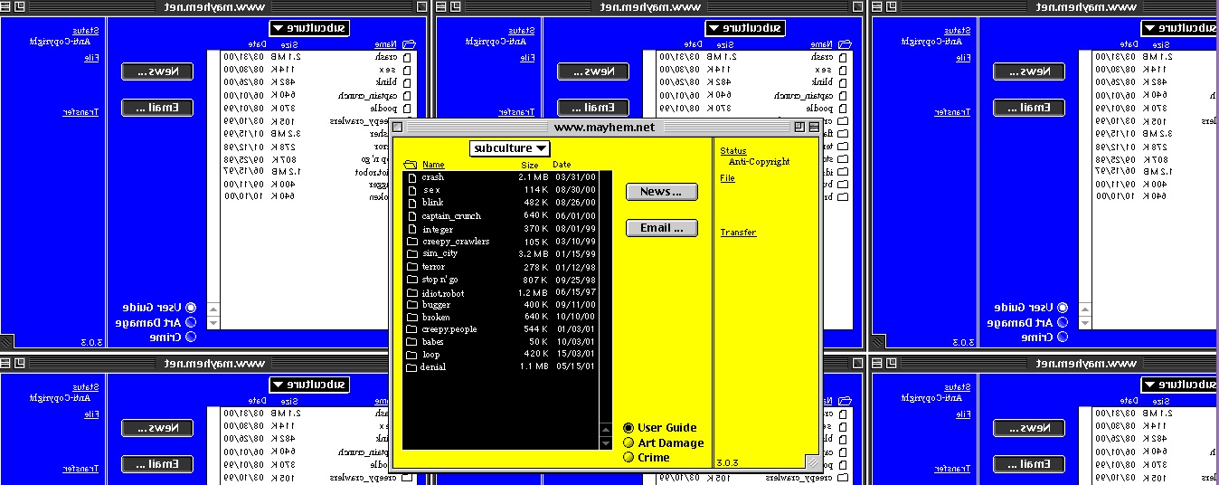 Art Damage é o nodo organizacional dos locais de arte da web. De acordo com o fim da propriedade intelectual foram criados locais usandoimagens, sons e manuscritos que foram pirateados de revistas, livros, CDs e outros locais existentes na web esses locais trabalham como meta-colagens em qual a hyperlinkage entre os atos das páginas tornam-se umelemento ativo na lógica desta colagem. Subculture é como o paraíso autista da web, cheio de informação mas aderidoirritantemente padrões repetitivos. é alternativamente simples e complicado, desencorajando, atraindo, encantando e aborrecendo, insensato e significante, organizado e caótico, bonito e feio. Snowcrash equivalente a um ataque apoplético de uma web epiléptica. É alto, retinal e perturbador, com páginas da web, se comportando de modos, os quais eles não deveriam estar. EXTREME.ANIME vomita fora umaiconografia sexual reciclada como a “chance surrealista velha se encontrando entre um guarda-chuva e uma máquina de costura em uma mesa dissecando”–constantemente reconfigurando isto de froma inflamadora e atraves de leituras não intencionais. Palavras chaves: pânico de dados, sexo, caos, apropriação, provando, pirataria, adoração de vírus, anthropomorphism, anti-direito autorais, abuso de browser, sobrecarga incorporada, arte de spam, que GUI batem, teia em rache, anna.kornikova.exe, vivendo melhor por, código.