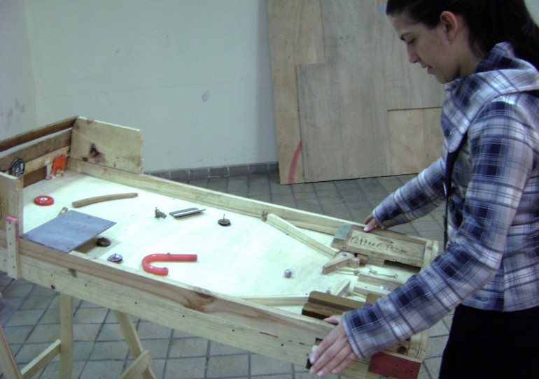 “Máquina/Brinquedo” é uma instalação cinético-interativa de baixa tecnologia inspirada nos games Pinball. Foi concebida no ano de 2010 em um processo aberto pelo “coletivo COLETORES”, em um espaço da periferia da zona sul da cidade de São Paulo (Centro Cultural Monte Azul) a partir da apropriação de materiais descartados. Seu funcionamento se dá por meio de propulsão humana, combinada a um dispositivo construído com madeira e borracha. Sua estrutura rudimentar dialoga com osdispositivos de interação presentes em máquinas de jogo, caça-níqueis e fliperamas, desdobrando-se como elemento relacional, entretenimento e imersão.