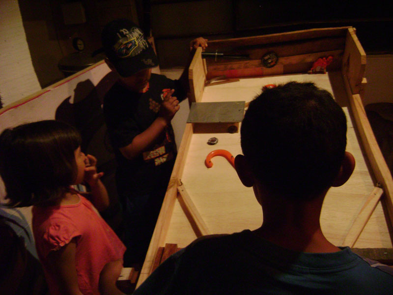 “Máquina/Brinquedo” é uma instalação cinético-interativa de baixa tecnologia inspirada nos games Pinball. Foi concebida no ano de 2010 em um processo aberto pelo “coletivo COLETORES”, em um espaço da periferia da zona sul da cidade de São Paulo (Centro Cultural Monte Azul) a partir da apropriação de materiais descartados. Seu funcionamento se dá por meio de propulsão humana, combinada a um dispositivo construído com madeira e borracha. Sua estrutura rudimentar dialoga com os dispositivos de interação presentes em máquinas de jogo, caça-níqueis e fliperamas, desdobrando-se como elemento relacional, entretenimento e imersão.