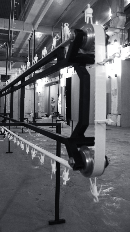 Uma pessoa deve correr em uma esteira para dar início ao processo (um mecanismo social). Por um lado, a pessoa sente-se como Deus, pois o movimento do mecanismo depende de seus passos, mas por outro, ele é apenas mais uma figura entre outras.