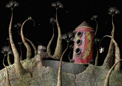 Fiz Samorost como minha dissertação de graduação. As dissertações em nosso departamento geralmente são filmes curtos animados, com bonecos ou desenhos. Decidi romper com essa tradição e fazer um jogo de computador online. O motivo disso é simples: a possibilidade de envolver o espectador na ação. Minha intenção não foi fazer um jogo de computador comum, mas algo novo e experimental para ser colocado na web. O jogo não é muito difícil e não exige experiência com jogos de computador. Meu objetivo foi fazer um agradável micromundo natural, no qual podemos entrar a qualquer momento e passear por ele. É especialmente dedicado às pessoas que trabalham com computador e podem relaxar por um momento passeando por esse pequeno mundo. A história não é a parte mais importante, como é geralmente nos filmes animados. Para romper a esterilidade do mundo do computador, usei como cenário de meu jogo colagens de fotos de várias coisas naturais. Tirar fotos de diferentes detalhes (raízes, musgos, etc.) na floresta foi minha primeira tarefa. Depois foi cortar, unir e retocar as fotos para criar cenas marcadas por minha fantasia. Então fiz correções de luz e cor. Até esse ponto, trabalhei com o programa Adobe Photoshop. Terminados os fundos, importei para o programa Macromedia Flash, onde fiz as animações, interatividade e acrescentei música e sons feitos especialmente para mim por meu amigo Tomas Dvorak.