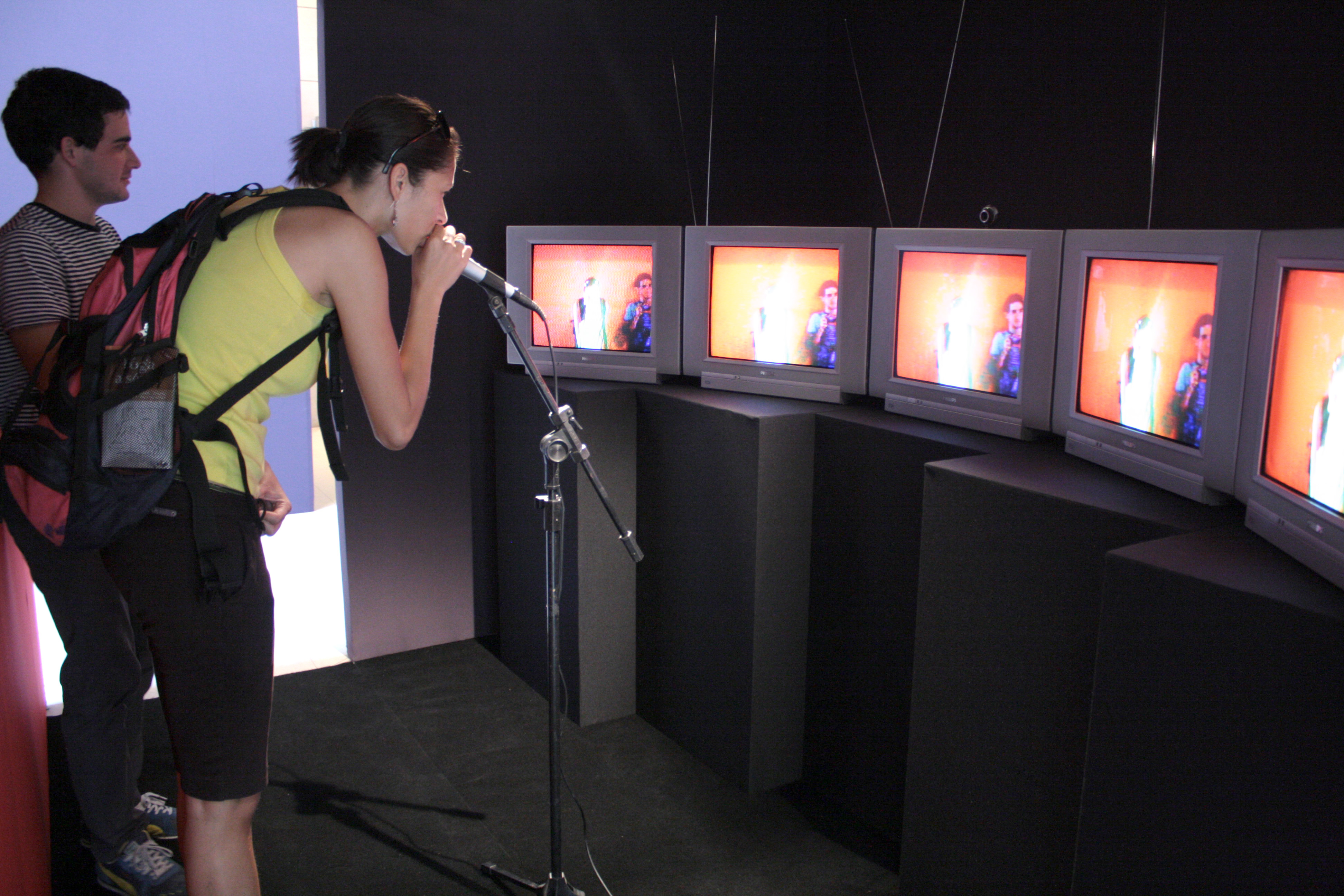 “Pois o que é liberdade? Ter a vontade da responsabilidade por si próprio. Preservar a distância que nos separa.” F.W. Nietzsche, In: Crepúsculo dos Ídolos, 1888 (Tradução de Paulo César de Souza) A instalação “Crepúsculo dos Ídolos” proporciona ao visitante uma experiência sensorial com a TV de uma maneira diferente da qual estamos acostumados no dia-a-dia. Nesta instalação em vez de tele-espectador passivo, o visitante pode exercer um controle sobre a imagem que está sendo transmitida por uma das redes de televisão de canais abertos naquele momento, apenas com sua voz, ou produzindo qualquer outro tipo de som. Esse controle consiste em um mecanismo de interação que distorce a imagem das TVs através de efeitos visuais cuja intensidade varia de acordo com o som que o visitante produz com sua voz capturada por um microfone. Esses efeitos são sintetizados até um dado instante em que a própria imagem do visitante (capturada discretamente por uma câmera) aparecerá nas telas das TVs. A instalação consiste em uma sala escura com 5 televisões ligadas em um mesmo canal aberto, sem áudio, apenas transmitindo a imagem da programação normal que estiver sendo exibida no momento. Por exemplo, pela noite, às 20:30, as TVs estarão exibindo a “novela das oito”. À frente das TVs haverá um microfone em um pedestal. Uma luz direcional branca (única luz da sala além das TVs) vindo do teto em direção ao microfone iluminará quem se posicionar em frente ao microfone. A posição do microfone, o silêncio e escuridão da sala e a luz spot funcionarão como um convite ao visitante para que este experimente falar algo ao microfone. Caso isso ocorra, a intensidade do som capturado pelo microfone controlará um efeito de distorção nas imagens das TVs, como por exemplo, saturação, estouro ou inversão das cores, deformação da imagem, ruído na imagem, etc. Quanto mais alto o som produzido pelo visitante maior será a intensidade do efeito provocado na imagem que será a mesma para as 5 TVs. Caso o visitante ultrapasse 3 segundos produzindo sons sem parar, a imagem das TVs, que no momento é a imagem do canal atual distorcida pelo som, será subitamente substituída pela imagem do próprio visitante. A imagem do visitante continuará aparecendo até que o mesmo pare de produzir o som por um intervalo de tempo que ultrapasse 5 segundos, voltando a ser exibido em cada TV, a imagem do canal, como antes. Assim, sempre que o visitante produzir um som continuamente por mais de 3 segundos, as TVs passarão a exibir sua imagem. E sempre que, depois disso, o visitante interromper o som por mais de 5 segundos sua imagem desaparecerá e será substituída pela imagem do canal. Este mecanismo de interação para processamento audiovisual integrado em tempo real é possível com o uso do software ViMus, trabalho de pesquisa vencedor do “Rumos – Arte Cibernética, Instituto Itaú Cultural”, desenvolvido pelo próprio autor da obra para seu mestrado em Ciência da Computação.