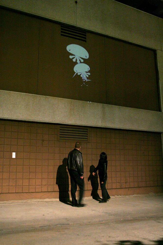 We Only Come Out at Night é um projeto de grafi te urbano envolvendo projeções públicas interativas. Um local é escolhido de madrugada e um adesivo é colado ou uma imagem em estêncil é pintada no local. Quando o sol se põe, imagens de águas-vivas são projetadas sobre a cabeça dos pedestres na rua. Quando os pedestres passam sob a projeção, os monstros agarram as sombras das pessoas e as comem. O adesivo é então removido e o projeto visita outro lugar de madrugada. Um website é criado para acompanhar a história do aparecimento do monstro, para promover e criar uma mitologia. Há sete monstros ao todo, cada um com desenho e comportamento únicos. Gula, o monstro que sempre come, Avaritia, o monstro que coloca você dentro de suas calças, Invidia, o monstro que pega sua imagem e fi nge ser você, e assim por diante. Cada monstro é único, mas sempre triste.