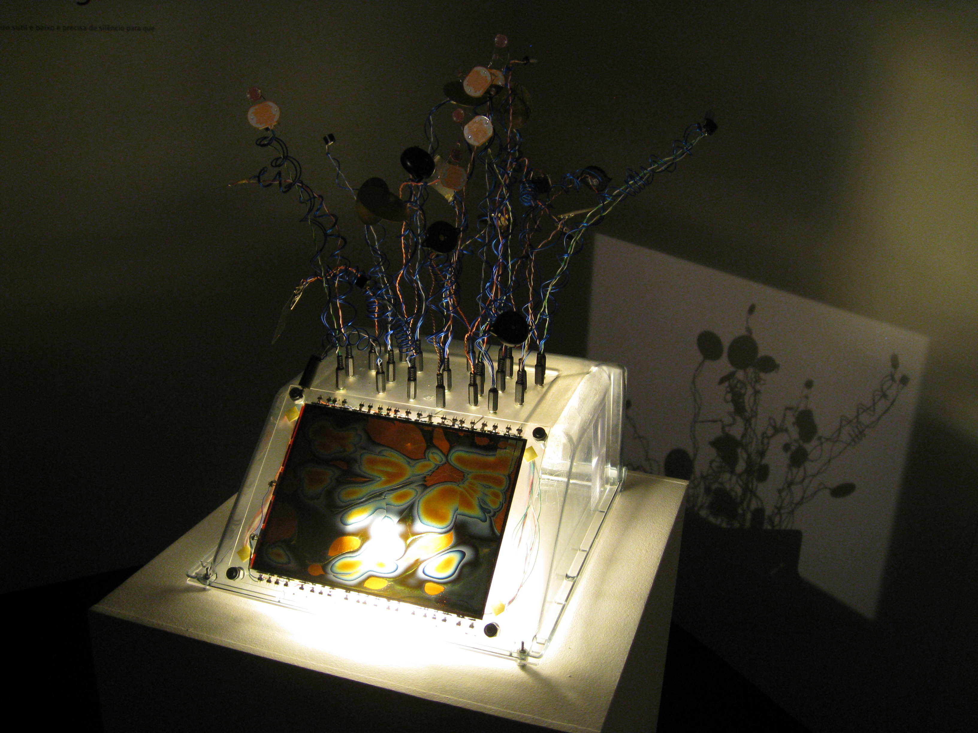 Estero (“Pântano”) é um objeto eletrônico reativo. Ele apresenta uma sequência de som em sincronia com a geração de linhas geométricas em um painel de LCD quebrado. O som escutado no vídeo vem de diferentes ativadores (motores DC, piezos, campainhas) ativados em sequência por um circuito integrado (CMOS 4017) controlado por outro (555). A velocidade da sequência pode ser modificada pelas ações de pessoas que aproximam suas mãos dos resistores fotossensíveis (na forma de estranhas “flores”). “Estero” usa uma grande porcentagem de componentes e materiais reciclados, incluindo painéis de LCD (laptop, videogames, calculadoras, telefones celulares), motores DC (câmeras digitais e analógicas quebradas), uma caixa de geladeira transparente, um transformador AC/DC (de um discman). O resultado é uma espécie de ecossistema artificial, um pântano ou mangue, com juncos e diversas plantas aquáticas emergindo da água. O som (a simples tradução de uma frequência mudando de onda quadrada) se refere aos muitos insetos que vivem perto desses lugares úmidos e quentes. Estero cria um clima sonoro muito sutil e baixo e precisa de silêncio para que a “música” seja ouvida. Estero não usa microcontroladores ou computadores programados. É simples eletrônica da velha guarda. O tabuleiro, os componentes, todos os fios podem ser vistos devido à caixa transparente, ampliada por uma lente Fresnell. O enorme emaranhado de cabos reforça a analogia com plantas aquáticas, parecendo raízes submarinas.