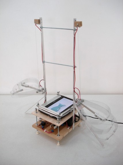 Meu trabalho consiste na invenção e construção de engenhocas que são comandadas por vídeos de objetos animados. Os objetos são pinçados do meu cotidiano visual: portas do meu ateliê, bules da cristaleira da sala, taças e jarros da coleção da minha mãe. Todos eles são filmados e seus movimentos enfatizados durante o processo de edição, de maneira a criar gestos caricatos semelhantes ao comportamento humano e animal. A manipulação do tempo do vídeo é determinante para a deformação das imagens, que não se resumem a meras representações do real. Empresto minha própria voz aos objetos e invento o idioma que é falado por eles. Os vídeos também emitem notas musicais que, ao serem percebidas por circuitos eletrônicos instalados no corpo da obra, coordenam sons, motores e músculos eletrônicos que fazem a obra se movimentar. Nos dois trabalhos apresentados no FILE, “Liquescer (Jarrinho)” e “Liquescer (Jarrinho Azul)”, os objetos escolhidos são jarros d’água cuja respiração é ritmada com a entrada e saída do líquido de seu interior. Os organismos reagem de acordo com os sons emitidos pelos objetos nos vídeos. Assim como a água, que possui a forma do recipiente que a contém, o comportamento sonoro e motor das obras é moldado pela linguagem dos jarros. Há uma autonomia presente nas máquinas que, a partir de materiais low e high-tech, comandam um diálogo que se manifesta através do precário e incerto movimento de interação entre suas partes. Ao contrário do que possa parecer num primeiro momento, os mecanismos somente respondem a estímulos internos. Não existe interação direta com o público, que permanece como um intruso em um mundo cuja comunicação se dá de forma sui generis e é ininteligível para nós.