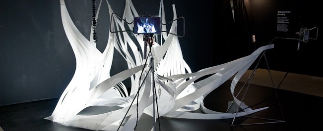 “Habitação Ectoplásmica” é uma especulação sobre como as casas podem mediar a predominância da era do “infocalipse”. Ela cultiva dados como elementos domésticos que crescem, florescem, morrem e assombram. A instalação é uma experiência arquitetônica de espaço físico e digital através do uso de design interativo e realidade aumentada. Ela opera como um meio que liga o público visitante a sua pegada invisível no espaço. Estendendo a construção física, uma camada de informação de realidade aumentada flutua no espaço e interage com os usuários. Através do uso de sensores, a presença das pessoas altera o espaço digital, gerando um loop de feedback entre o físico e o digital. Nesse cenário, a arquitetura é menos um abrigo histórico e depósito de lixo contemporâneo de interface social digital fantasmagórica do que um kit interface para sobrevivência na era do “infocalipse”.