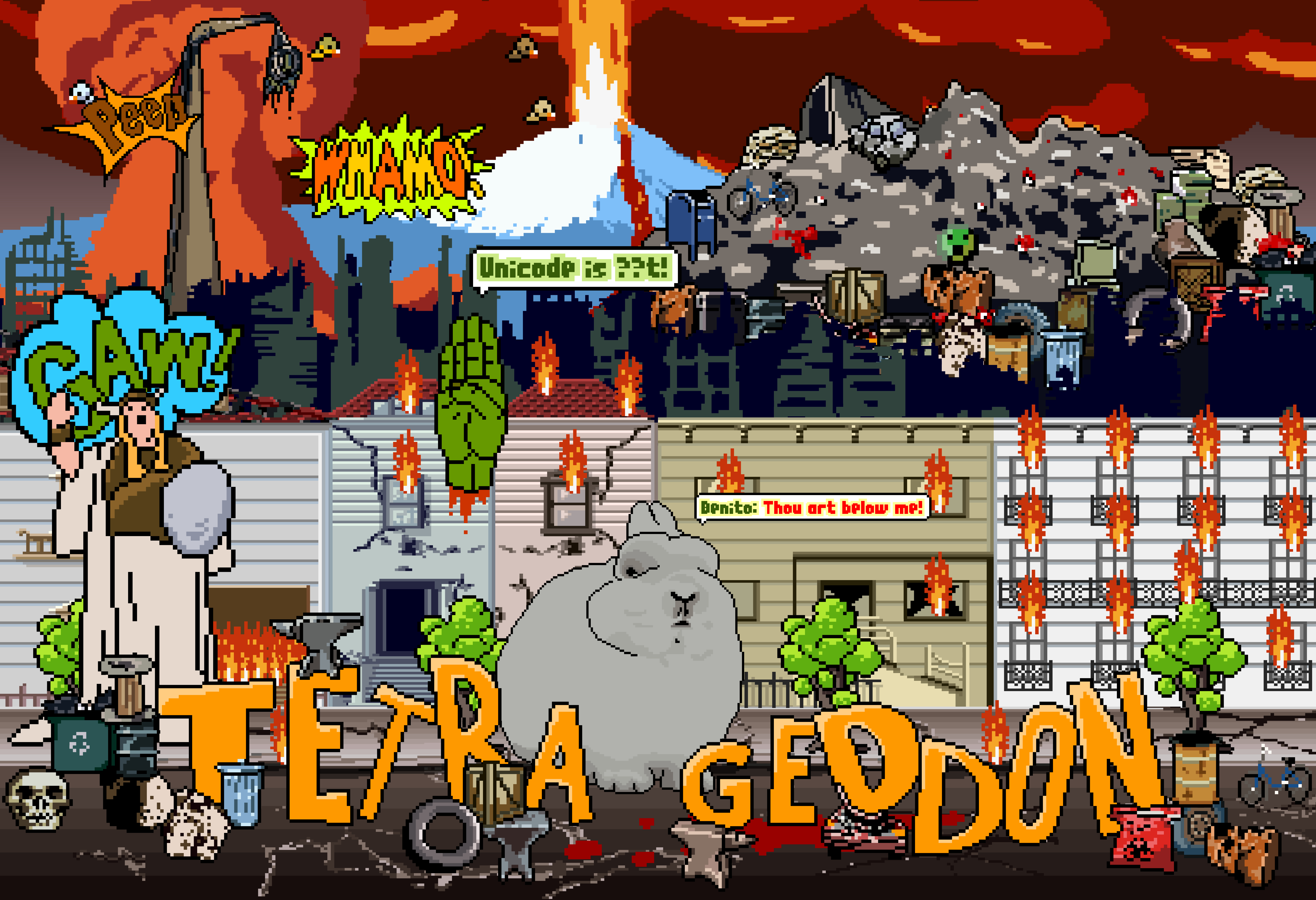 “Tetrageddon Games” é um arcade freeware de código aberto criado para explorar a redefinição de interatividade e como a interatividade revolucionou o entretenimento usando a mídia de jogos e a Internet como plataforma de distribuição. Ele consiste em uma coleção de “pop games” traduzindo os tabus culturais, ícones e o humor da Internet na era digital.