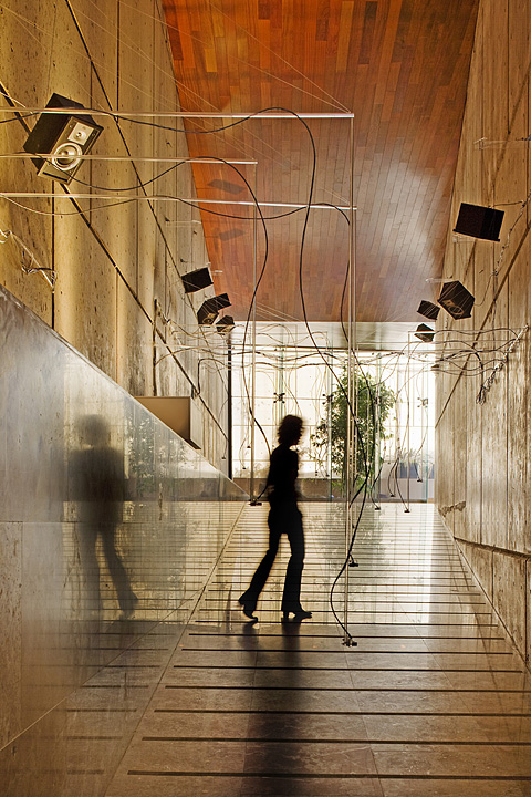“Entre Corpos” conecta as ações dos visitantes com as energias corporais que circulam por Tijuana (México), tornando viscerais nossas ligações com a vasta rede de agência humana que funciona na cidade. Produtos montados com grande custo humano em Tijuana são vendidos no mundo inteiro, mas a onda da mídia sugere que nossa única conexão com a cidade é através do medo. Ingerimos a incansável ração de crimes ligados a drogas; deliciosamente aterrorizada, a maioria se afasta da cidade, efetuando um bloqueio crescente. Essa falta de representação plena da vida cívica de Tijuana também põe em curto-circuito quaisquer ações sociais que um retrato mais rico poderia gerar. O ciclo prejudicial de isolamento alimentado pela mídia não é único a Tijuana. Se estamos vivendo numa economia de atenção, os movimentos dos visitantes em “Entre Corpos” provocam anúncios sonoros de energia cívica que anima Tijuana. Mas esses anúncios exigem que você forneça sua energia corporal à troca. A instalação mostra o trabalho cotidiano e gestos sonoros, gravados por toda a cidade. Esses gestos sonoros são provocados e modificados pelos movimentos naturais dos visitantes pela peça. Volume, tom, velocidade e sobreposição de sons são modulados em tempo real, em relação com as ações de um visitante e a proximidade de sensores pendurados no espaço. O corpo do visitante torna-se um instrumento sintonizador, um transdutor de outras energias corporais. Idealmente, essa transdução não é uma rua de mão única. Para explorar o som do corpo de outra pessoa é necessário apenas escutar seus ritmos, interiorizá-los de certa maneira. Uma compreensão corporal é desejada. A pesquisa mostra que os gestos são um importante contribuinte da formação da língua e da abstração. Realizar um novo gesto gera uma nova lógica? Nossa compreensão do mundo muda conforme gestos menores são usados para encontrar um terreno maior? Em “Entre Corpos”, os gestos dos visitantes são rastreados para conectá-los com a vida em Tijuana, salientando atos cotidianos que formam uma enorme fonte de energia criativa. A instalação reúne vestígios dessa eergia em um espaço onde ela pode ser sentida como uma fonte de energia comum, colocando a agência de Tijuana em diálogo com as intenções dos que geralmente rastreiam a fronteira — aqui sensores permitem que os visitantes, através de atos de transdução corporal, percebam as vidas dos tijuanenses de uma maneira mais rica.