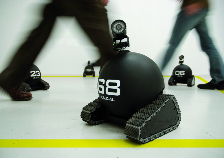 Devido à proliferação crescente de câmeras de vigilância, há uma paranóia diária mundial de insegurança, à qual chamamos de “sociedade da vigilância”. Este projeto visa criar uma série de câmeras robóticas “vivas” que seguem as pessoas. Os visitantes serão gravados por câmeras, e as imagens serão exibidas no local e via internet. Notícias: O ministro do Interior da França anunciou: novas medidas de segurança serão implementadas em Paris triplicando o número de câmeras de vigilância para 6.500 unidades. Nova York também estuda um projeto de 90 milhões de dólares para desenvolver seu próprio “Cinturão de Aço”; semelhante ao cinturão de vigilância de Londres (65 mil câmeras na City). Na Espanha, a cidade de Barcelona afirma que precisa instalar câmeras em “áreas problemáticas”. Como se vê pelas notícias acima, o problema é a tênue linha divisória entre a busca pelo máximo de segurança e o direito à privacidade. As chamadas “políticas do medo” e a “ideologia da segurança” se tornaram o mantra de um sistema de controle totalitário. Por fim, há muitas câmeras de vigilância IP na internet. Entrando no Google em “inurl:/view/shtml”, você pode ter acesso a 168 mil câmeras públicas e privadas. Agora, além do controle por parte de instituições, existe a fascinação voyeurística. Estamos vivendo em um descontrolado panóptico universal com centenas de milhares de câmeras monitorando um verdadeiro Big Brother em um mundo de paredes de vidro. A instalação enfoca a criação de um conjunto de quatro robôs, incluindo Câmeras de Vigilância (câmera de circuito fechado de TV). Os robôs são equipados com sistemas de posicionamento com base espacial, e o movimento e a direção são controlados por uma unidade eletrônica baseada em Arduino. O software que controla todos os processos e comanda tudo é desenvolvido com o uso de bibliotecas de fonte aberta (OpenFrameworks) e é conectado com os robôs através de um sistema wireless. Dependendo da posição dos visitantes e dos robôs captada pela câmera zenith, o sistema envia diferentes comportamentos para os robôs. Além disso, há câmeras IP que mostram toda a instalação e mandam todos os dados para nossa webpage, onde há janelas exibindo imagens de câmeras reais (situadas no Google). Um metassistema de vigilância é montado no local e a instalação toda pode ser simultaneamente monitorada pela internet por qualquer usuário anônimo.