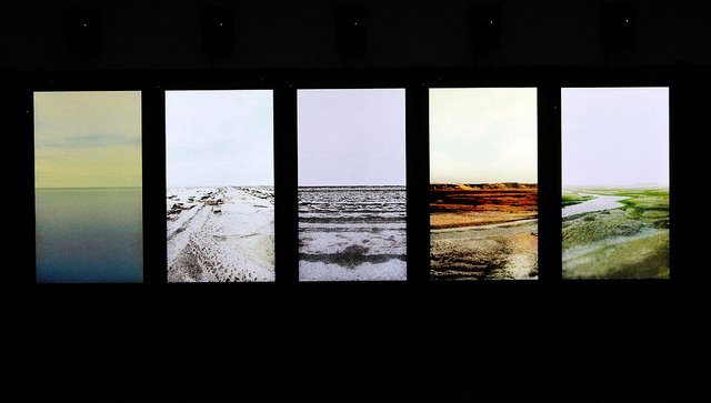 “Rheo: 5 horizons” é uma instalação audiovisual composta por 5 displays em painéis planos e 5 alto-falantes com múltiplos canais. Cada imagem em sentido vertical é casada com um som em canal mono, e cada vídeo é sincronizado com um áudio. Eles ficam justapostos, alinhados como um conjunto de 5 elementos, e se comportam como 5 aparatos audiovisuais independentes. Sintetizada com o movimento da imagem, a cognição espacial do som pode ser intensificada. Ou seja, um comportamento imagético indica a posição inicial, a direção e o impulso do som. Isso faz com que o espaço redescubra o movimento e a posição do som, e a relação entre ego e som. Essas ressonâncias exercem um impacto sobre a percepção sensorial, o que desenvolve uma experiência sinestésica semelhante. O som ganha amplitude e profundidade por meio de uma integração dos sentidos auditivo e visual, e forma uma construção audiovisual espacial que propicia um novo reconhecimento do espaço. O termo grego “rheo” no título significa fluxo, corrente, jorro, e esta obra traduz a transição temporal e espacial para o movimento audiovisual como um fluido dinâmico. Incorpora também a noção de fluidez do tempo utilizando a composição audiovisual no espaço. A integração de imagem e som define o movimento temporal espacialmente, a direção, a velocidade, as formas, cores, pesos e texturas na linha de tempo paralela. E coloca a dinâmica de sons e imagens mutantes em forma de diagrama. Os sons e imagens com múltiplas camadas montam a escultura do tempo em um ciclo formado por um loop de 8 minutos.