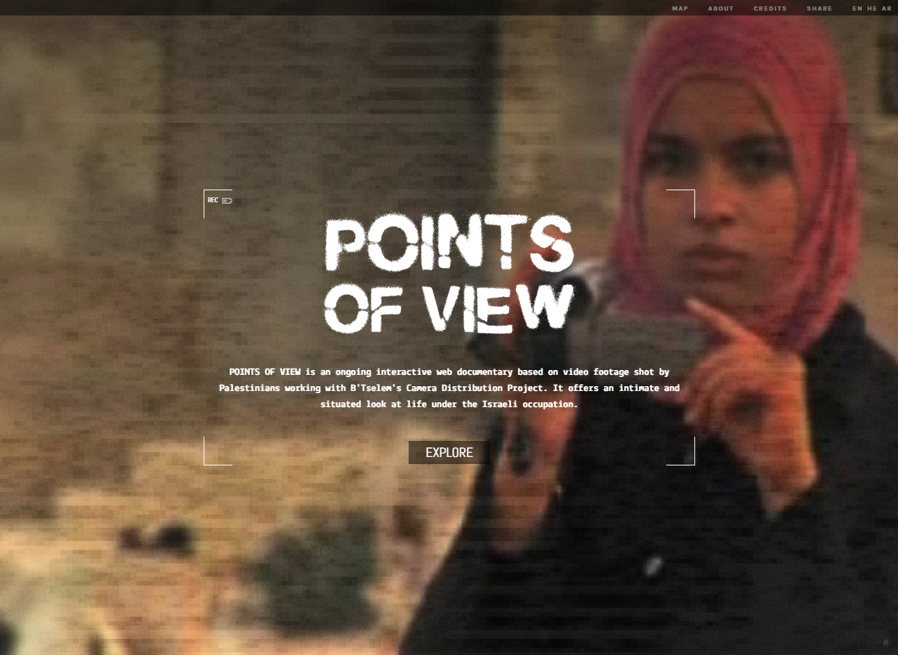 “Points of View” é um documentário interativo e contínuo da web baseado em imagens de vídeo feitas por palestinos trabalhando com o B’Tselem’s Camera Distribution Project. Ele oferece uma visão íntima e situada na vida sob a ocupação israelense.