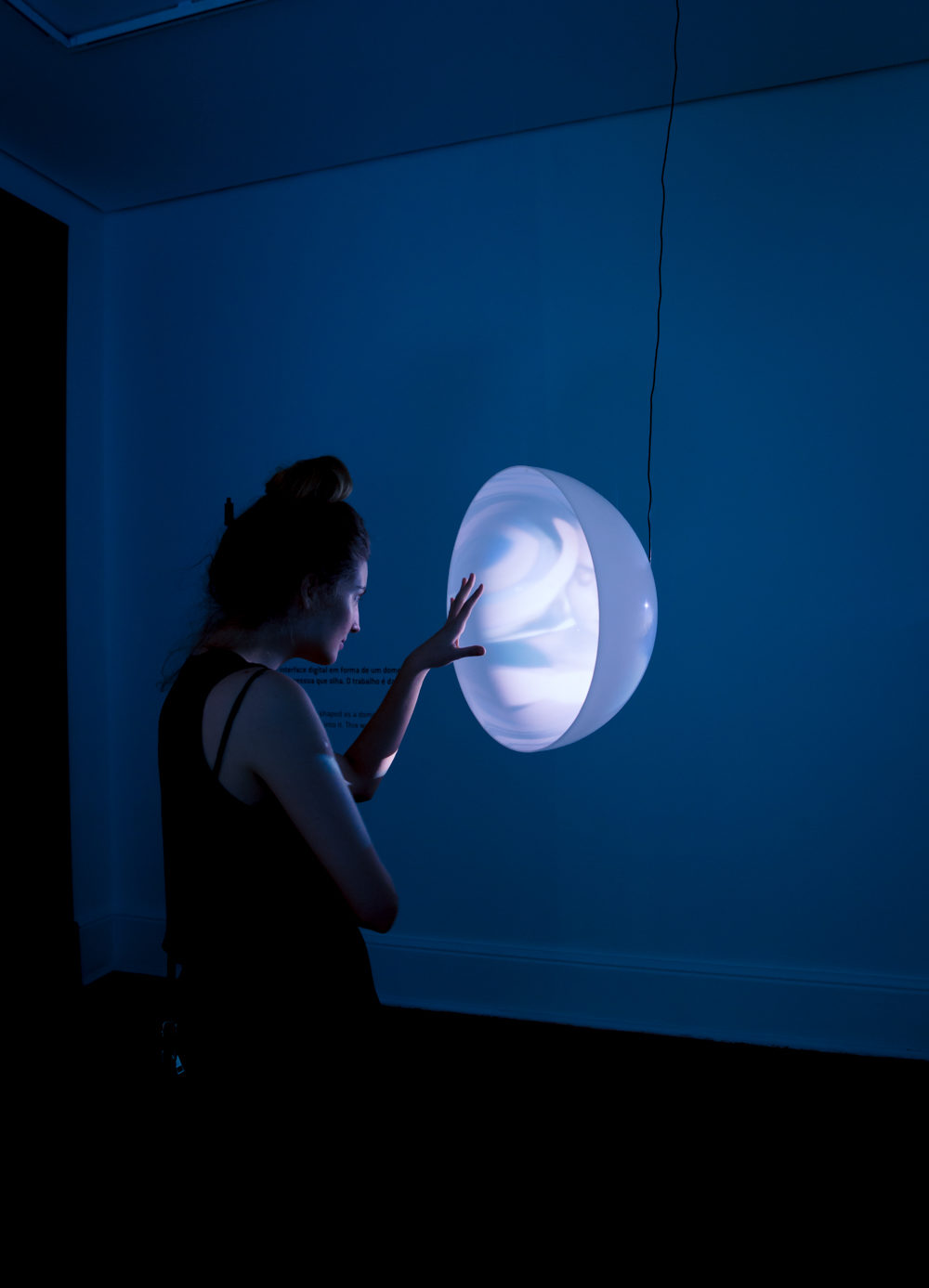“On Shame” é uma interface digital em forma de um dome espelho que distorce a pessoa que olha. O trabalho é da série Psicossomáticos.