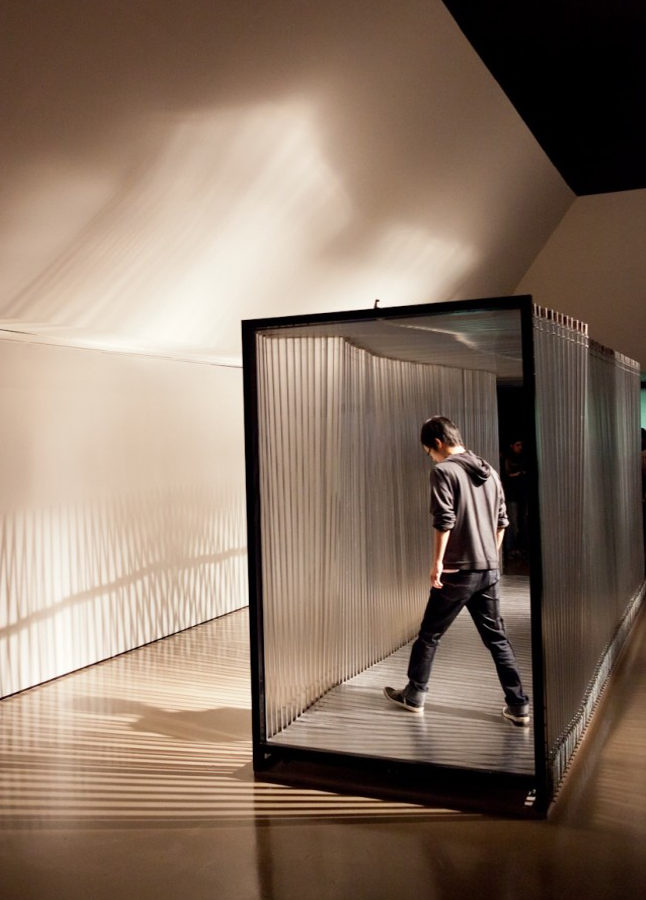 “Túnel” é uma escultura cinética, imersiva e interativa, composta de 92 pórticos que se desalinham em função da posição e da massa do corpo do interator. Vários usuários podem entrar e interagir simultaneamente na máquina. Interatores agenciam a máquina via posicionamento e peso. Um exemplo de interação é: você entra no “Túnel” e se posiciona próximo a uma das paredes laterais. Nesse caso, a posição relativa e a força gravitacional do seu corpo provocam variações na altura do piso. O piso inclina em até 5º, rotaciona progressivamente os pórticos associados na direção e no ângulo correspondentes, e com isso propaga movimentos ondulatórios em toda a extensão da obra. Para o observador externo, movimentos internos ou o seu deslocamento em relação à obra produzem efeitos óticos cinéticos.