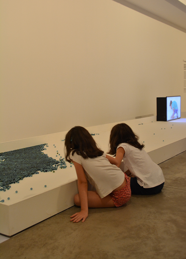 A instalação “Vídeo-Boleba” é composta por uma TV e um mecanismo que atira bolas de gude. No vídeo, dois meninos se revezam jogando as bolinhas que, ao sumirem do quadro, aparecem pela lateral da tela, espalhando-se no espaço próximo ao público e dando continuidade à cena no plano material.