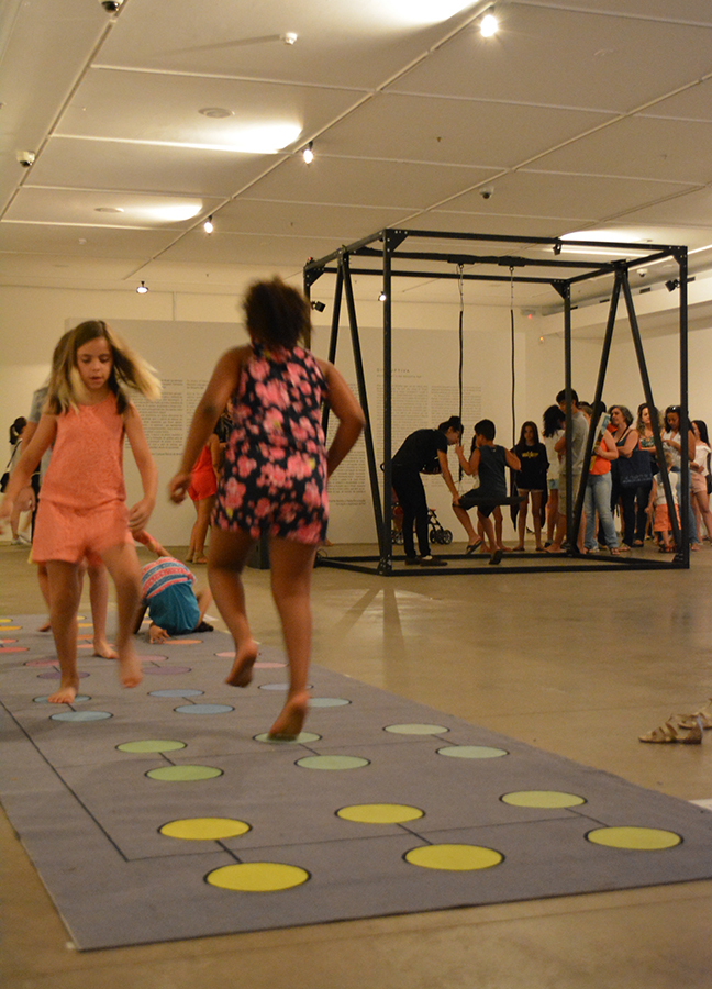 “The Flooor” é um instrumento musical colaborativo e um local de encontro social. Trinta e seis sensores sob um tapete, conectados a um computador musical montado debaixo do piso e alto-falantes montados no teto.