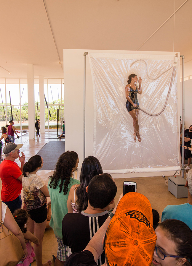 Duas grandes folhas de plástico transparente e um dispositivo que gradualmente suga o ar entre elas deixam o corpo (neste caso, o próprio artista) embalado a vácuo e verticalmente suspenso. O tubo transparente inserido entre as duas superfícies permite que a pessoa dentro da instalação regule o fluxo de ar. Como resultado da pressão crescente entre as folhas de plástico, a superfície do corpo embalado gradualmente se paralisa em múltiplas microdobras. Durante a duração da performance, a pessoa no interior move-se lentamente e muda de lugar, que varia de uma posição quase embrionária a uma semelhante a um corpo crucificado.
