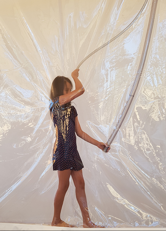 Duas grandes folhas de plástico transparente e um dispositivo que gradualmente suga o ar entre elas deixam o corpo (neste caso, o próprio artista) embalado a vácuo e verticalmente suspenso. O tubo transparente inserido entre as duas superfícies permite que a pessoa dentro da instalação regule o fluxo de ar. Como resultado da pressão crescente entre as folhas de plástico, a superfície do corpo embalado gradualmente se paralisa em múltiplas microdobras. Durante a duração da performance, a pessoa no interior move-se lentamente e muda de lugar, que varia de uma posição quase embrionária a uma semelhante a um corpo crucificado.