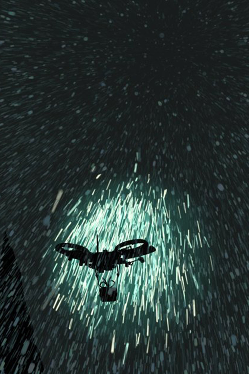 Um drone de entrega voador está carregando um pacote em uma vasta paisagem devastada. Este filme foi feito como abertura para os Prêmios do Festival Ciclope de 2016.
