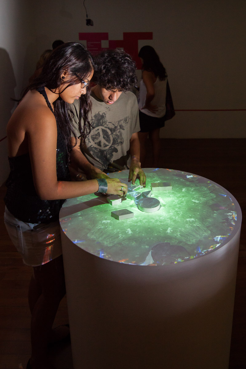 Na cultura lúdica atual, vemos a coexistência de nosso legado de jogos tradicionais com tecnologias de ponta. Este rico encontro entre o passado e o “futuro” suscita novas questões empolgantes sobre como jogamos, ou brincamos, e que tipo de papel o jogo tem em nossa sociedade. O ato de jogar, ou brincar, pode ser examinado através de diferentes teorias e perspectivas. Psicanalistas pós-freudianos o consideram não só como um meio potencial para o inconsciente se manifestar, mas como um espaço singular entre realidade e fantasia, no qual se pode cometer erros sem consequência e regras podem ser mesclada de acordo com a imaginação. Isso é uma capacidade essencial para pensar e explorar diferentes pontos de vista e maneiras de ver o mundo, que constituem o arcabouço básico de uma sociedade democrática. Assim, o foco deste projeto é como ato de jogar pode nos levar a descobrir padrões culturais e sociais e, ao mesmo tempo, criar um playground para explorar novas dinâmicas e maneiras de pensar. A partir desses questionamentos, “Mesa Del Tiempo” foi originalmente projetada para o Museu do Brinquedo San Isidro (Buenos Aires, Argentina), com o intuito de desenvolver novas configurações para jogos tradicionais usando tecnologia de ponta. Cada uma das diferentes instalações (Shadows, Kaleidoscope, Simon e Oca, entre outras) propõe novos modelos de jogo. Aquelas selecionadas para o Festival FILE (Shadows e Kaleidoscope) também têm dinâmicas simples e transparentes que dão bastante liberdade para que os usuários explorem a relação entre autoexpressão e organização social Créditos: – Autor e desenvolvedor: Patricio Gonzalez Vivo – Produzido a pedido do Museo del Juguete San Isidro, Argentina Mesa del Tiempo: Kaleidoscope Esta instalação é baseada no caleidoscópio, o popular e antigo brinquedo óptico, que ela recria e transforma para que múltiplos usuários possam interagir entre si em um divertido diálogo estético. Ela convida à exploração de diferentes composições de texturas e cores por meio do uso de blocos simples de madeira com formatos variados. Quando cada um desses elementos geométricos toca a superfície da mesa, uma textura é fixada virtualmente e então projetada sobre a mesa. Há uma área triangular rotatória que espelha tudo dentro dela. Assim como em um caleidoscópio real, as imagens se repetem ao redor da mesa. A instalação “Kaleidoscope” foi projetada para colocar esse brinquedo óptico tradicional no campo lúdico contemporâneo, atualizando-o para que haja diversos jogadores simultâneos, e com isso revelando as múltiplas visões e possibilidades viáveis através da colaboração.