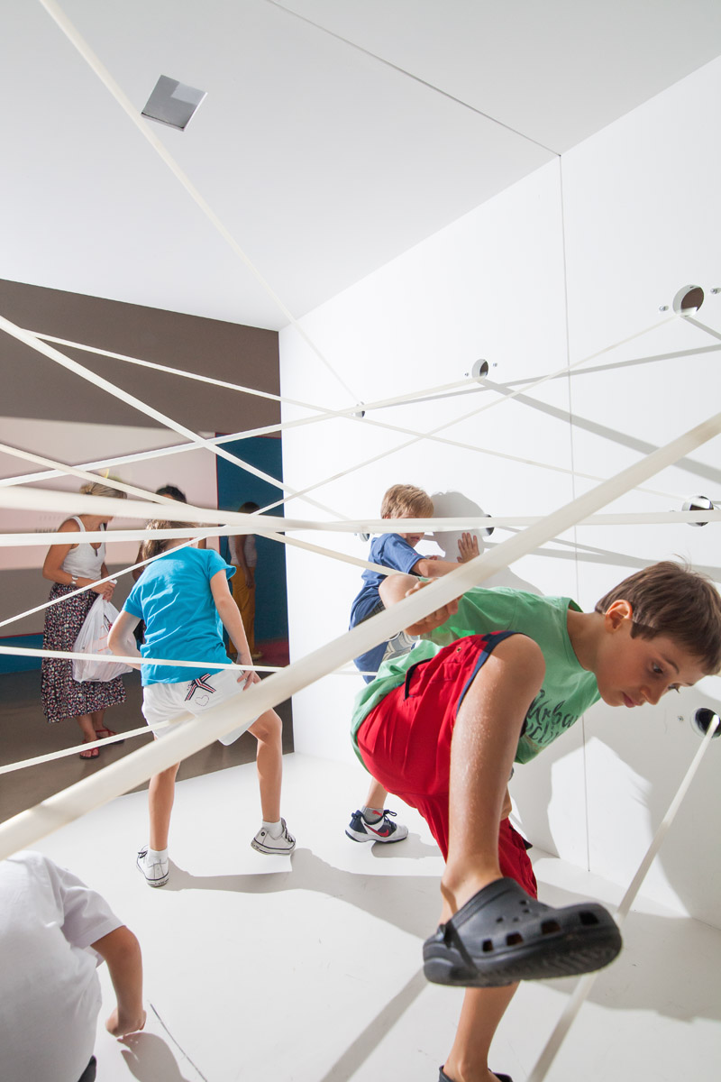 “De Novo, Ercília” (2012) é uma instalação sonora interativa que convida o visitante a atravessá-la e experimentar padrões corporais e sonoros por meio da interação com elásticos. Em seu livro “As Cidades Invisíveis”, Italo Calvino menciona Ercília, uma cidade onde se estendem fios para designar as relações entre as pessoas e as coisas. De tempos em tempos, Ercília é abandonada e remontada em outro lugar. Dialogando com o sintético tratado sobre desenvolvimento urbano e a própria existência sugerido pelo autor, “De Novo, Ercília” é um projeto itinerante. E em sua primeira versão, construída para a Mostra LabMis 2011, Ercília foi à cidade de São Paulo.