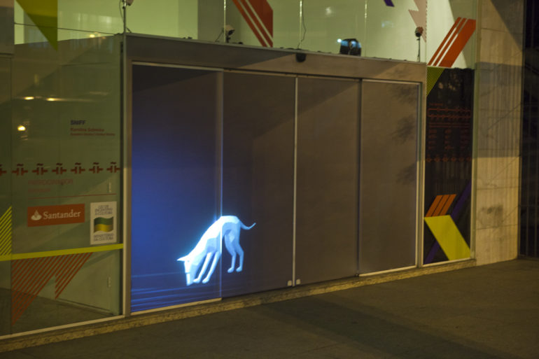 “Sniff” é uma projeção interativa em uma vitrine de loja que dá para uma calçada pública, simulando um envolvimento na vida real. Um cão animado segue o espectador, reage a seus gestos e forma um relacionamento com ele baseado na história de sua interação. A personalidade do cão é moldada pela relação que ele teve no passado e se expressa na modulação de comportamento sempre que um novo espectador se aproxima dele.