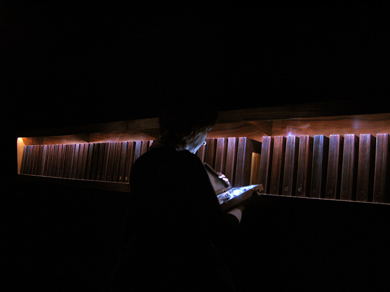 A instalação interativa “Reler” consiste em uma prateleira de madeira com 50 livros, semelhante a uma biblioteca. Todos os livros aparentemente são iguais uns aos outros, mesma cor e mesmo tamanho, identificados unicamente por um número dourado estampado na sua lombada. Mas, não são livros comuns, são livros para serem ouvidos e não lidos. Pequenos trechos prediletos, escolha pessoal de 50 pessoas convidadas a participar da execução da instalação, cada livro tem seu dono e sua voz. Ao abrir um livro, o interator tem seu rosto iluminado por um led, ao mesmo tempo que um sistema embutido de gravação de áudio com circuito integrado, especialmente desenhado para a obra, dispara o som pré-gravado da voz daquele que selecionou esse trecho do seu livro predileto, com no máximo quatro minutos. Simultaneamente, no espaço expositivo, todos os textos sendo “lidos”, isto é tirados da prateleira e abertos, vão se somando uns ao outro por uma interface conectada ao computador, formando um som quadrifônico no ambiente, em tempo real. Criando assim um palimpsesto de vozes, timbres, idiomas que vai se modificando continuamente a medida que ocorrem novas retiradas e devoluções dos livros. Nessa instalação imersiva interativa a presença do interator e suas escolhas pessoais são parte de tantas outras escolhas individuais, que juntas, formam a voz da instalação.