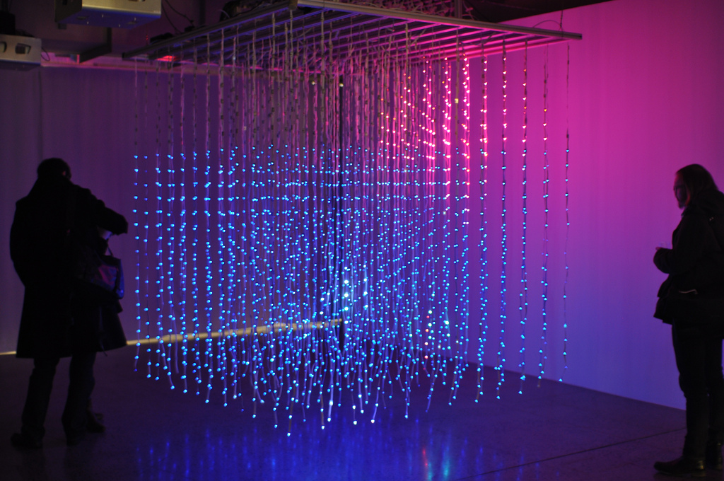 O projeto Ocean of Light explora as possibilidades criativas e imersivas de visualização baseada em luz no espaço físico em tempo real. Ele usa hardware e software criados pelos artistas para dar a qualquer pessoa a possibilidade de gerar esculturas de luz dinâmicas, interativas e tridimensionais. O projeto é o resultado de uma antiga ambição do grupo Squidsoup de criar conteúdo visual interativo para ocupar o espaço físico real. O desejo era passar do objeto para o ambiente, permitindo que as pessoas caminhassem através da obra, em vez de ao redor dela. O hardware é uma construção do tamanho de uma sala com 12 x 12 fileiras de LEDs que formam um cubo suspenso do teto. Cada fileira de LEDs consiste em 24 LEDs individuais, que têm a capacidade de produzir uma gama de 256 cores. Os LEDs foram escolhidos para o projeto por serem relativamente baratos, contarem de maneira significativa com as tecnologias existentes (neste caso tecnologia de parede de vídeo), não terem partes móveis e exigirem relativamente pouca energia. A primeira obra de arte produzida com esse hardware, “Surface”, combina interação e visualizações em 3D para criar um ecossistema virtual reagente que ocupa o espaço físico. Agentes autônomos navegam pelo espaço e negociam uma superfície dinâmica; tanto a superfície como os agentes reagem à paisagem sonora que os cerca. A combinação de composição linear e intervenção interativa na peça cria uma experiência maravilhosa, hipnótica e totalmente envolvente para o público.