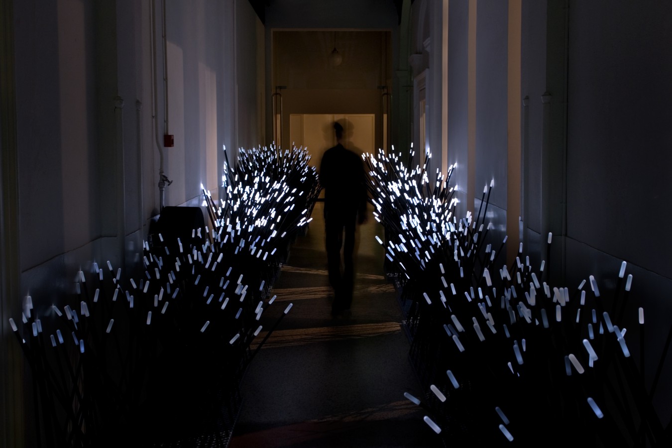 “Dune” é um cenário interativo que reage ao comportamento das pessoas. O híbrido de natureza e tecnologia surge a partir de grandes quantidades de fibras, que são iluminadas de acordo com os sons e o movimento dos visitantes passando. O trabalho investiga a natureza em uma relação futurista com o espaço urbano, pelo olhar, andar e interagir.