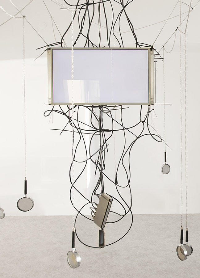 “SIMULACRA” é uma disposição experimental optofísica. Em seu âmago estão quatro painéis monitores de LCD, que são montados na forma de um quadrado oco e instalados na altura dos olhos no meio da sala. O conjunto aparenta estar internamente eviscerado, espalhado e envolvido. Um emaranhado de cabos e dispositivos de controle é derramado a partir do meio do quadrado. Ao redor, diversas lentes de aumento estão penduradas em correntes. O raio ofuscante e sem imagens dos monitores dá a impressão de que suas imagens caíram. O que sobra é a essência do meio: Luz.