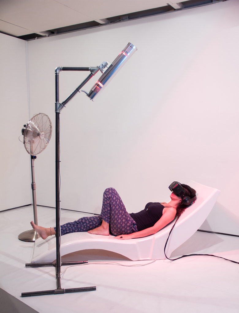 Na instalação, criamos uma ilusão ao ativar todos os sentidos com uma combinação de cheiro, toque (através de luz infravermelha e um ventilador), imagem (com óculos de filme 3D em 360 graus) e som omni.