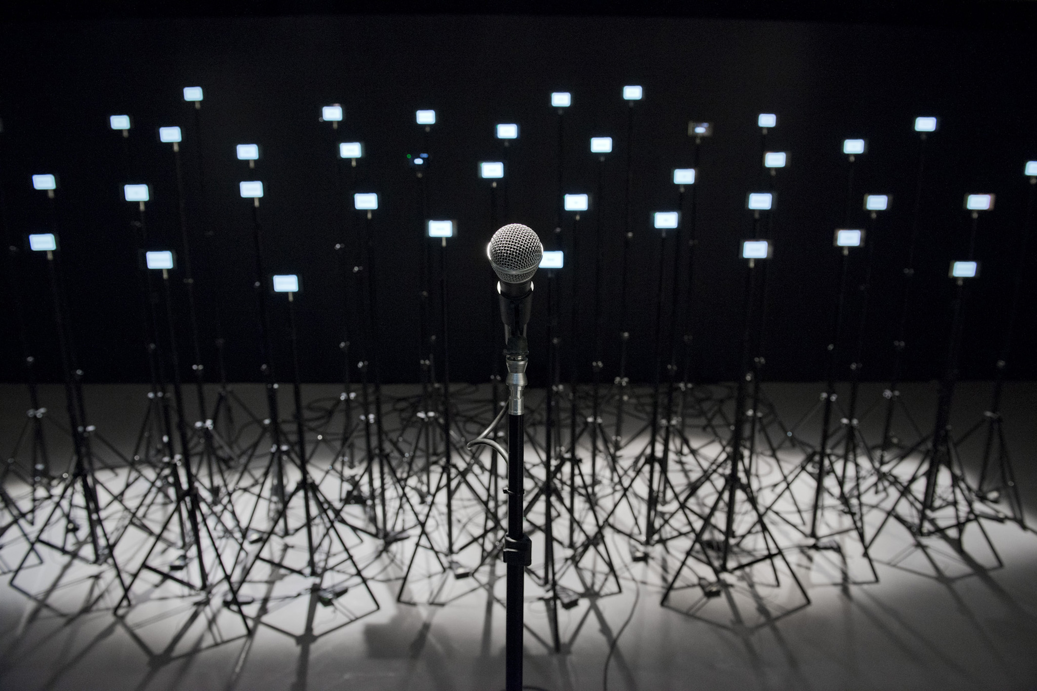 Uma máquina de falar autônoma e interativa, desenhada para estabelecer comunicação e sincronização automáticas entre humanos e máquinas, e entre máquinas e máquinas. Na instalação, um microfone faz a interface com um “coro” de quarenta celulares. Todos os aparelhos estão em estado de escuta para captar vozes e outras sonoridades. A máquina de falar autônoma analisa as informações e estabelece equivalências com sua memória. Caso positivo, a máquina gera um resultado audiovisual com um significado semântico similar ao som captado, ou seja, fala e exibe nas telas uma palavra idêntica ou semelhante ao da palavra escutada. Caixas de som e visualização de palavras nas telas dos aparelhos celulares possibilitam um “diálogo”, e aos humanos, escutar e ver a conversa maquínica.