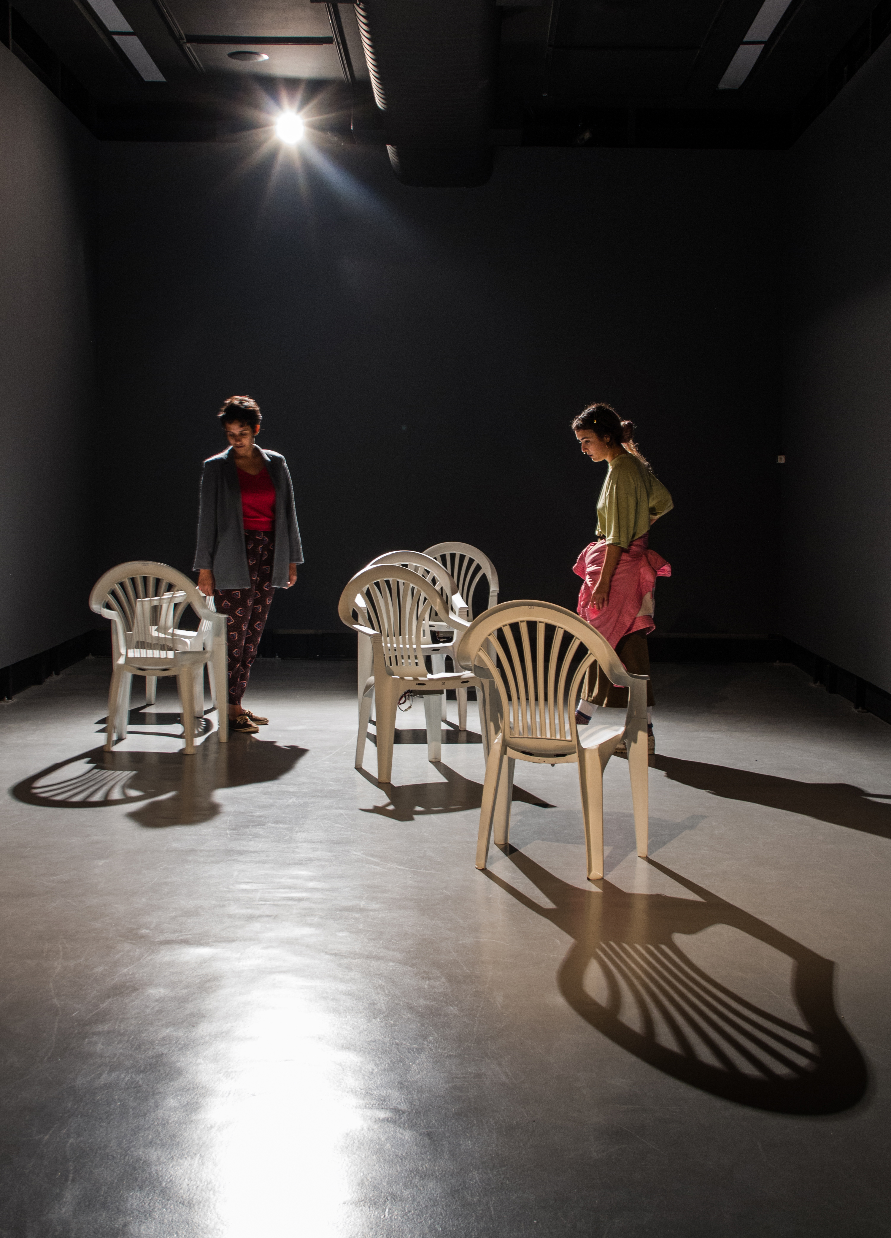 Um par de cadeiras vibratórias está se movendo e girando lenta e aleatoriamente através do espaço. Elas parecem procurar e rejeitar umas às outras com zumbidos suaves. Quando um visitante passa, as cadeiras hesitam e, cuidadosamente, experimentam padrões diferentes. Os padrões não são projetados; é um sistema auto-organizado onde novas composições e novos comportamentos surgem espontaneamente durante a duração da instalação.