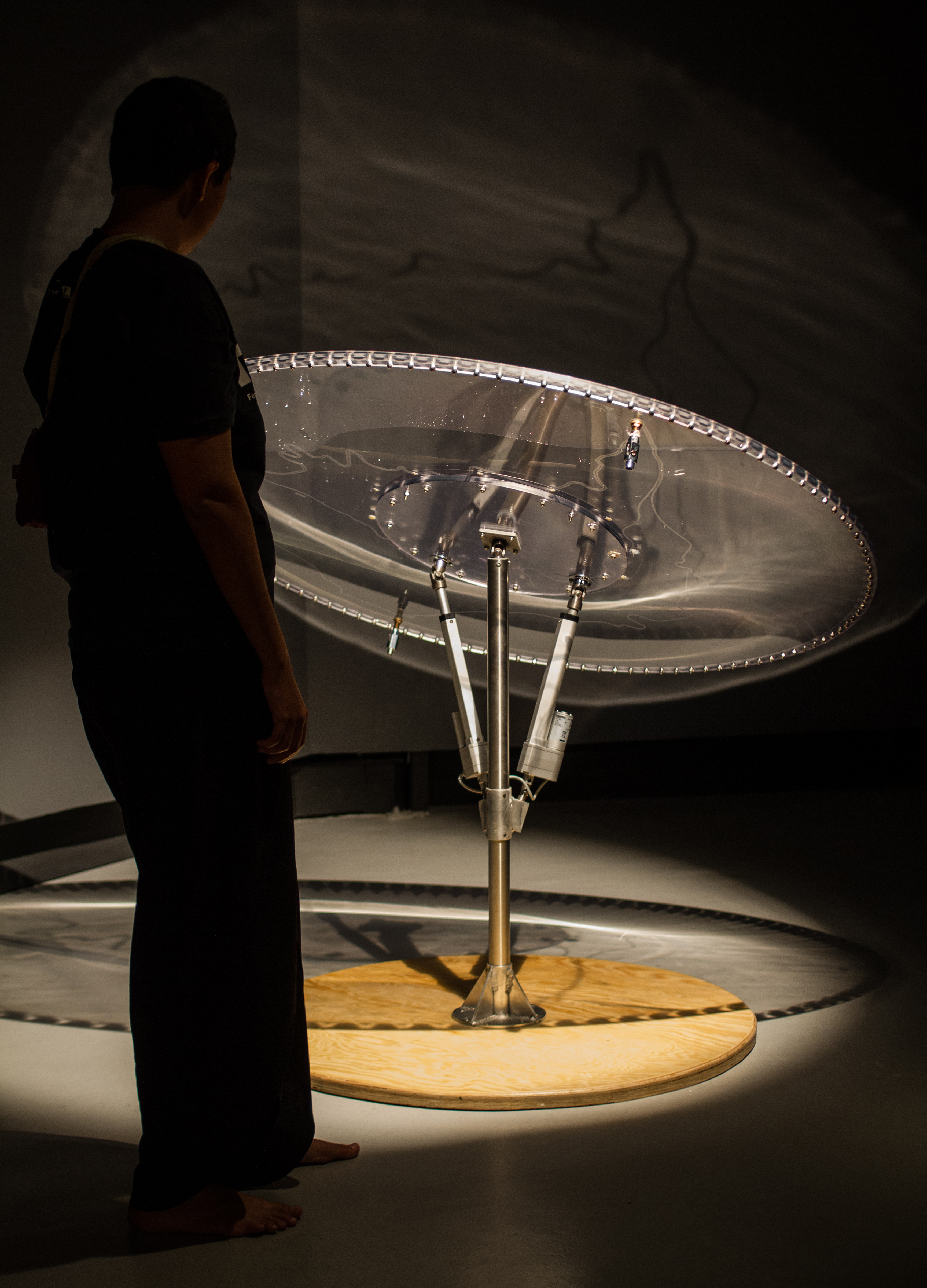 Uma camada de água é contida por duas placas de vidro. Dois motores inclinam o disco de vidro em ângulos pouco visíveis. Uma grande bolha de ar lentamente muda de forma e se move na água. Ela tenta encontrar um novo equilíbrio sob um mapa do gelo ártico que é impresso sobre o vidro. Um holofote circunda a instalação como um sol. Ele projeta uma sombra giratória incluindo padrões de movimento da água que não são visíveis no disco original.