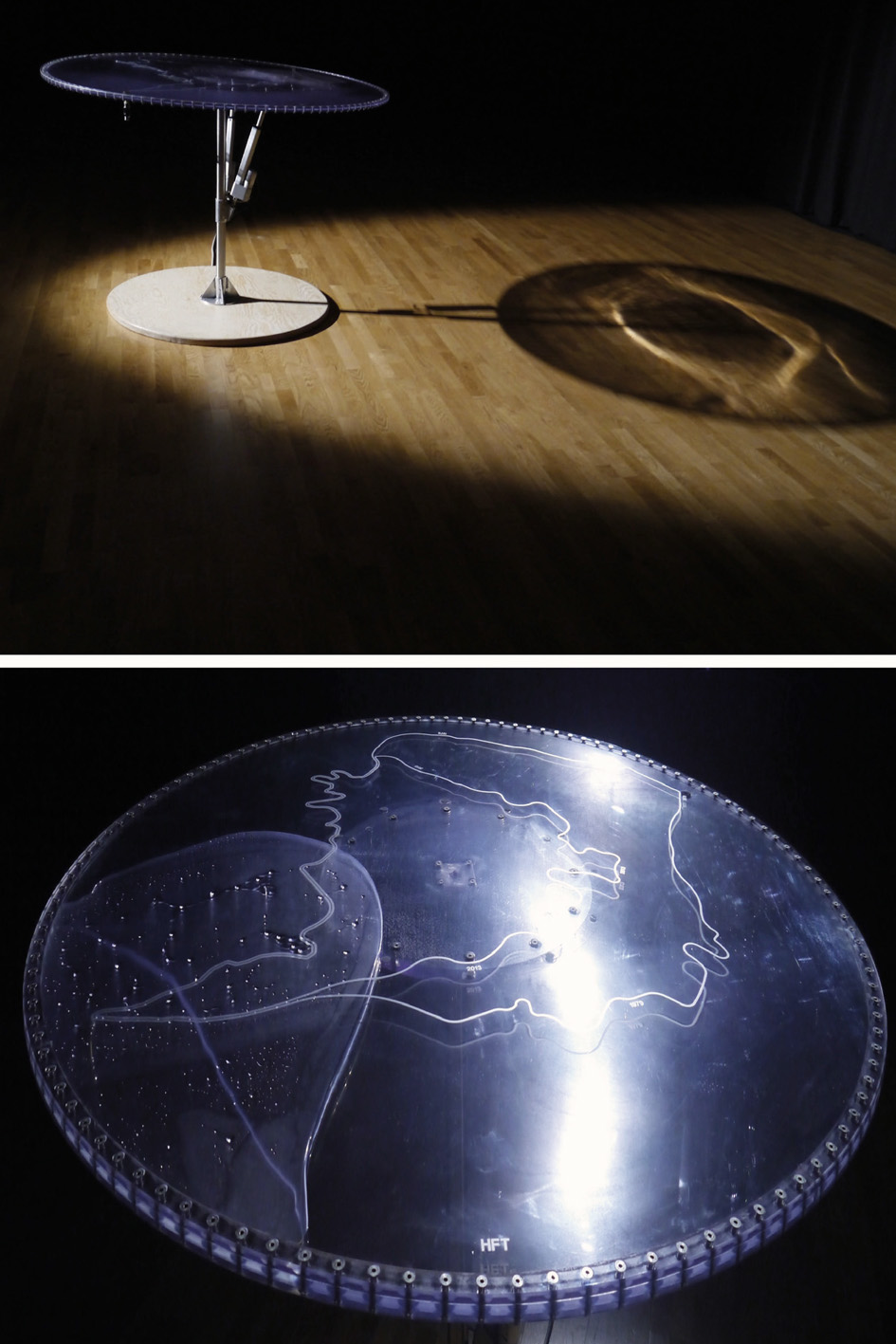 Uma camada de água é contida por duas placas de vidro. Dois motores inclinam o disco de vidro em ângulos pouco visíveis. Uma grande bolha de ar lentamente muda de forma e se move na água. Ela tenta encontrar um novo equilíbrio sob um mapa do gelo ártico que é impresso sobre o vidro. Um holofote circunda a instalação como um sol. Ele projeta uma sombra giratória incluindo padrões de movimento da água que não são visíveis no disco original.