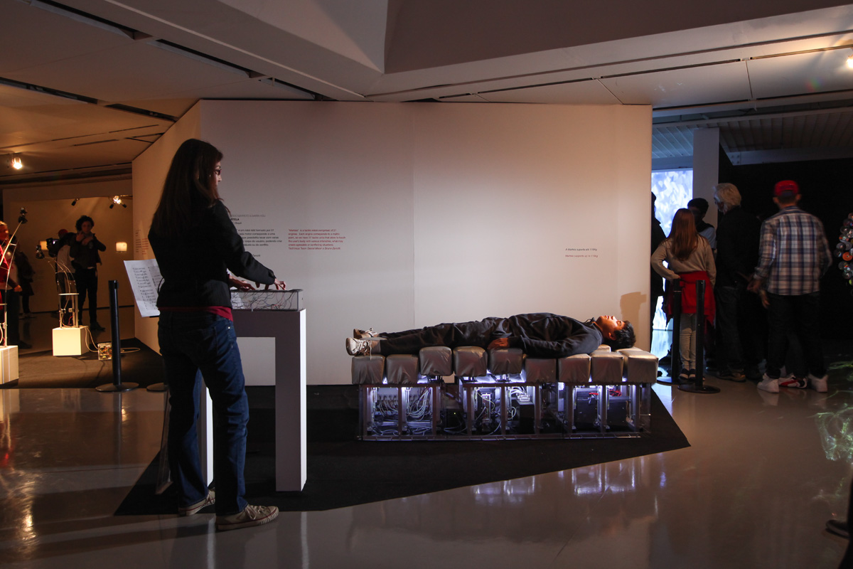 A primeira máquina tátil se chama “Martela’, um robô tátil formado por 27 motores subdivididos por três quadrados (3×3), ou seja, cada quadrado possui 9 motores. Cada motor corresponde a um ponto em matriz e temos assim 27 unidades táteis que possibilitam tocar com várias intensidades o corpo do usuário.