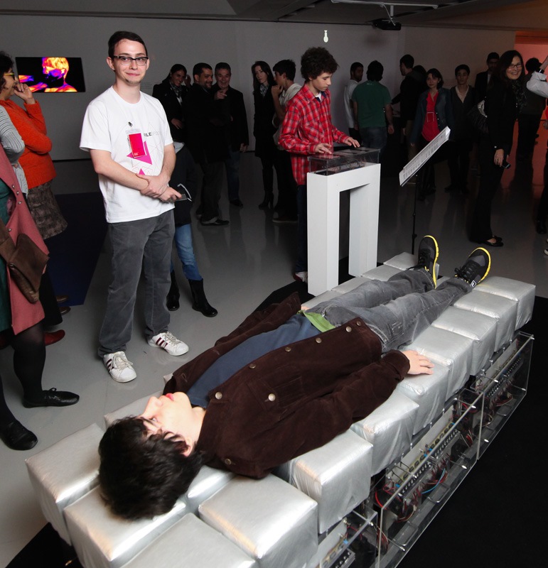 A primeira máquina tátil se chama “Martela’, um robô tátil formado por 27 motores subdivididos por três quadrados (3×3), ou seja, cada quadrado possui 9 motores. Cada motor corresponde a um ponto em matriz e temos assim 27 unidades táteis que possibilitam tocar com várias intensidades o corpo do usuário.
