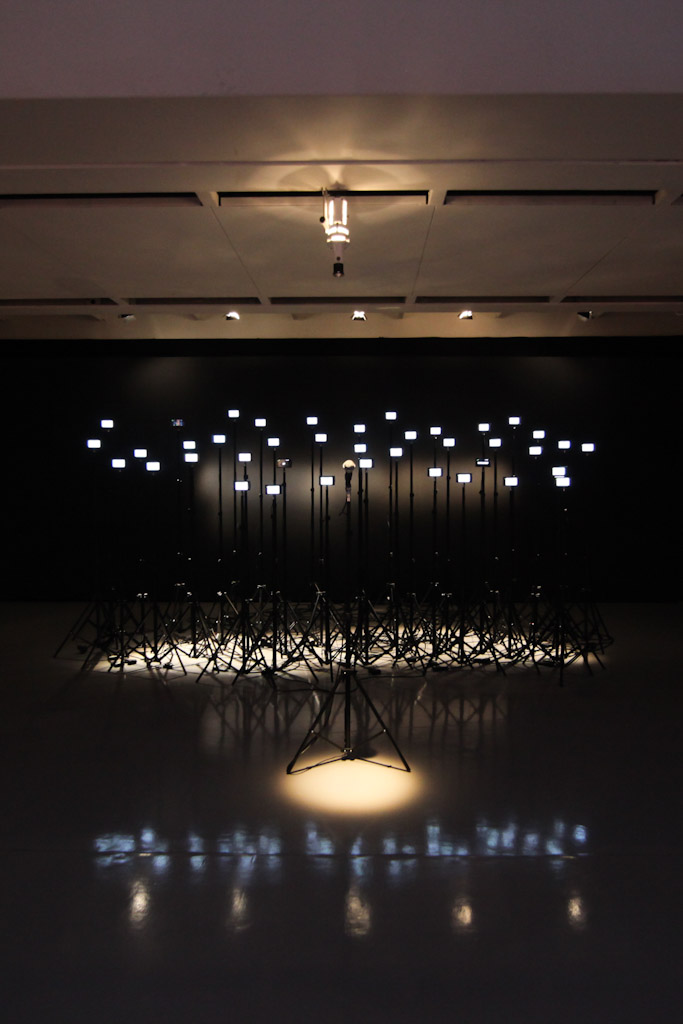 Uma máquina de falar autônoma e interativa, desenhada para estabelecer comunicação e sincronização automáticas entre humanos e máquinas, e entre máquinas e máquinas. Na instalação, um microfone faz a interface com um “coro” de quarenta celulares. Todos os aparelhos estão em estado de escuta para captar vozes e outras sonoridades. A máquina de falar autônoma analisa as informações e estabelece equivalências com sua memória. Caso positivo, a máquina gera um resultado audiovisual com um significado semântico similar ao som captado, ou seja, fala e exibe nas telas uma palavra idêntica ou semelhante ao da palavra escutada. Caixas de som e visualização de palavras nas telas dos aparelhos celulares possibilitam um “diálogo”, e aos humanos, escutar e ver a conversa maquínica.