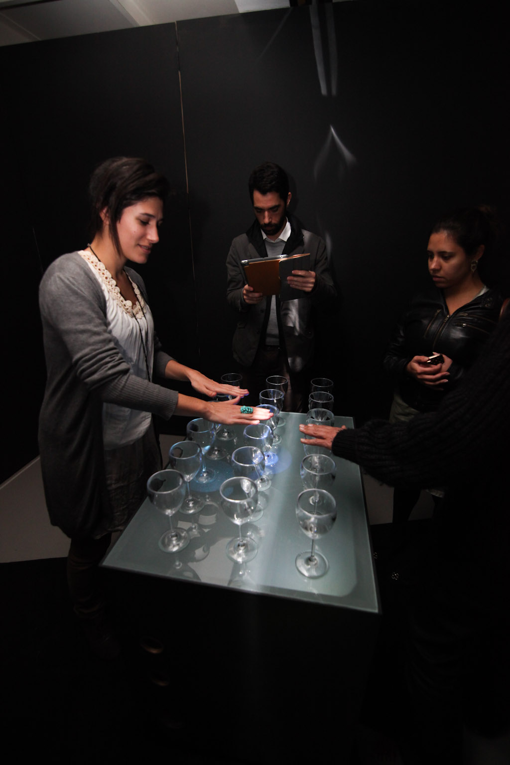 A partir do movimento das mãos sobre as taças, pode-se definir novos padrões sonoros. Estimulando os sentidos, surgem novas possibilidades criativas, através da experiência individual de cada espectador. Nesse jogo gerado pela representação de algo tão antigo, propomos uma releitura e uma justa homenagem, a Franklin e à sua harmônica.