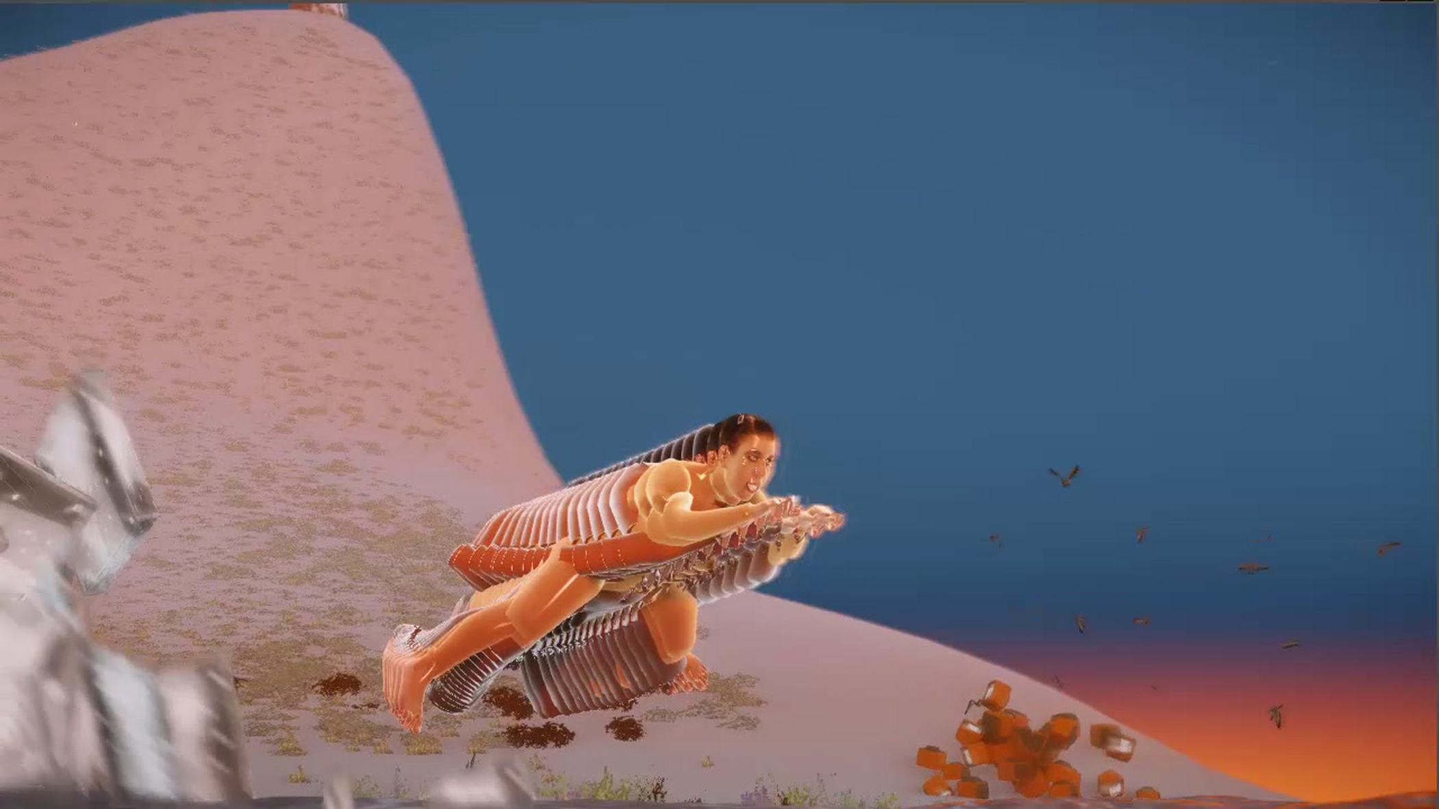 Cada um desses experimentos foi feito em menos de 5 horas e sua finalidade era explorar um tipo de mundo surreal dentro da máquina. Eles não são sonhos, e sim interpretações erradas de espaços fragmentados e avatares elétricos figurativos; tudo foi criado usando comportamentos “defeituosos” em meio a visuais muito avançados e o engine de física. Mas em vez de buscar um realismo fotográfico, eu tento achar um tipo de tragicomédia usando falhas e “erros”. Tudo com a ajuda (e inspiração) das “paisagens sonoras de ruídos” profundas de Päl Asle Andersen.