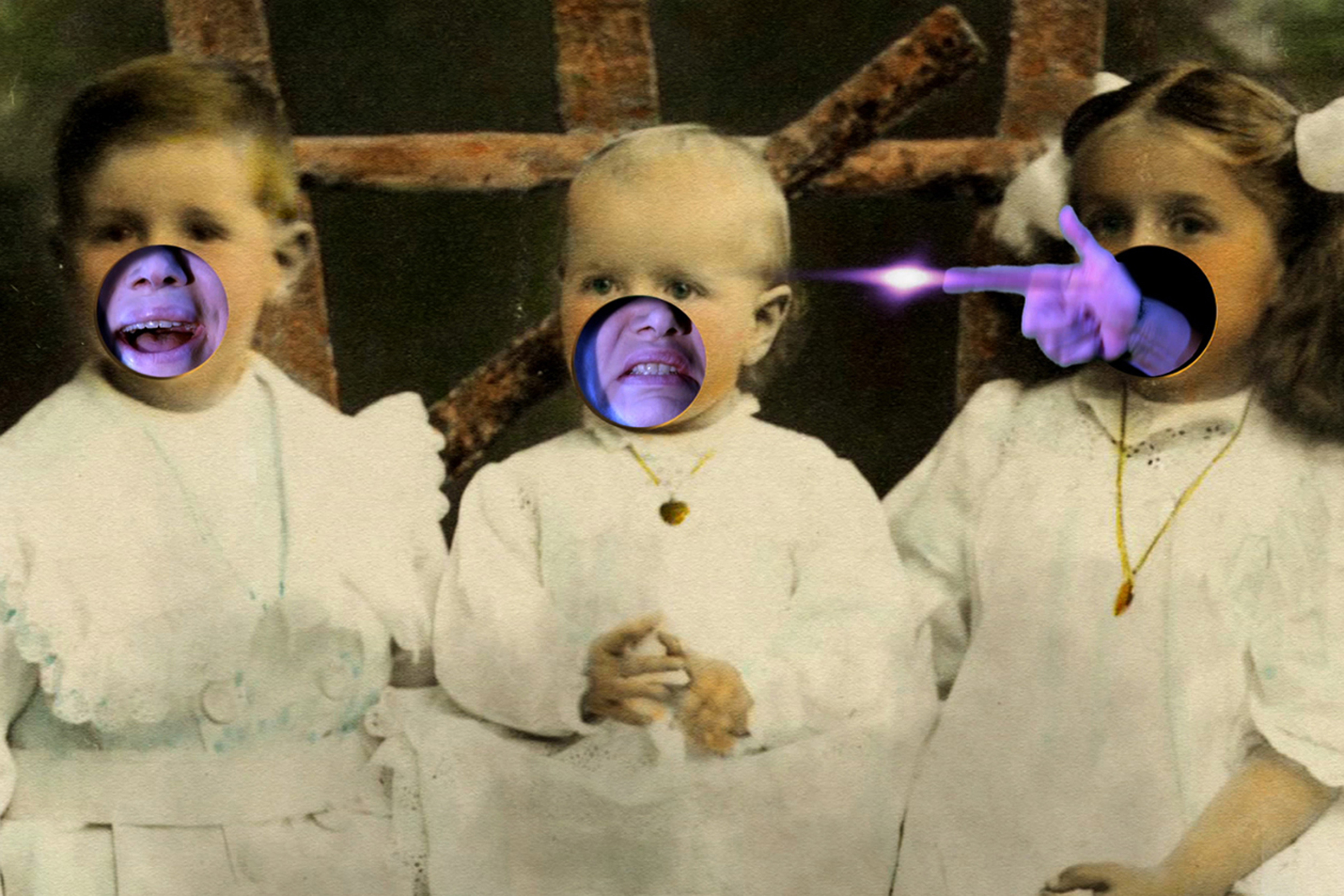 É o início do século XX e três crianças estão posando para uma foto de família. Esse é o ponto de partida para uma transformação digital na qual a parte inferior do rosto da artista substitui a mesma parte facial das crianças. Em uma inversão de tempo e significado cristalizada em um não tempo e um não significado, surge um tipo diferente de história.