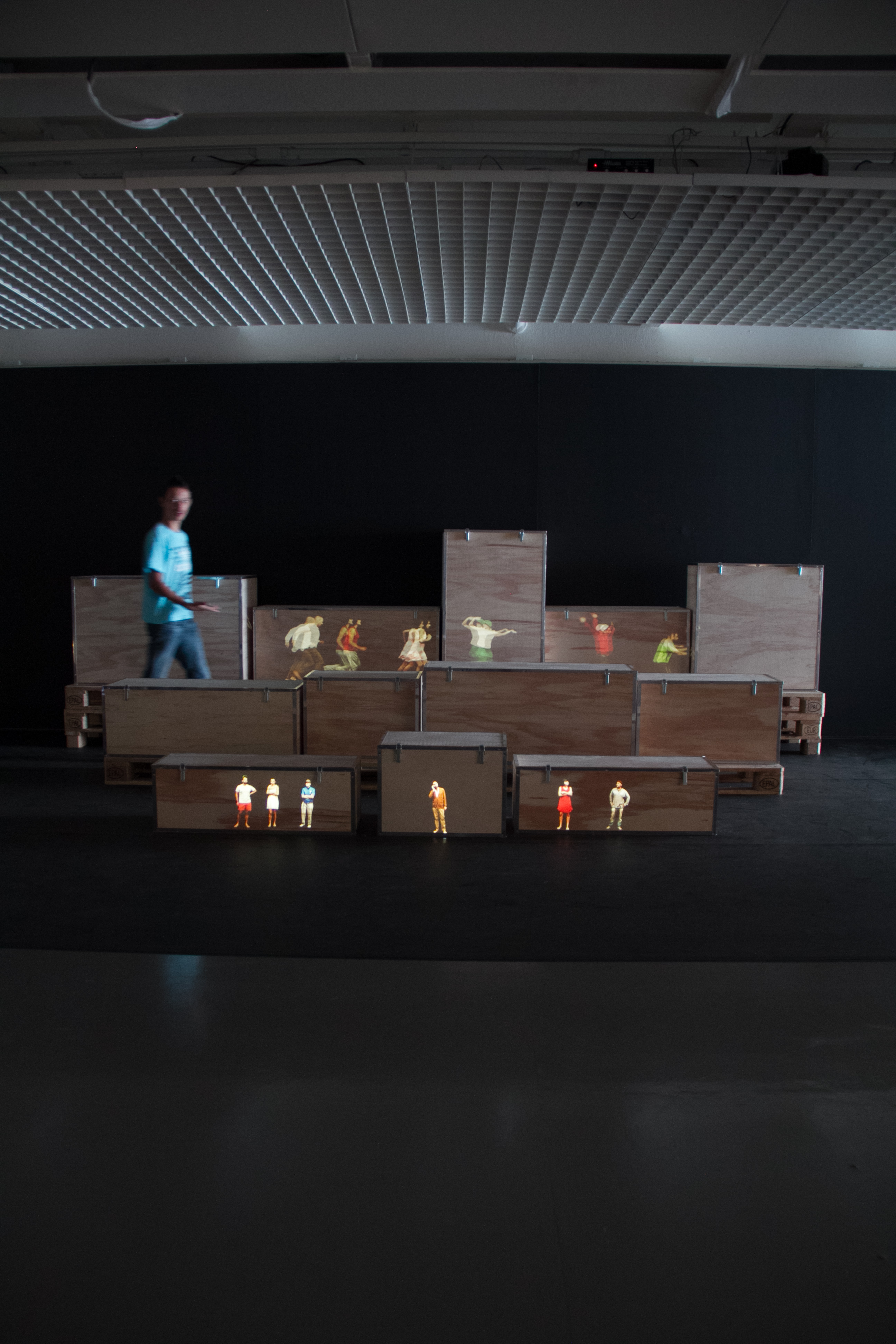 “Little Boxes” é uma instalação artística que videomapeia projeções com o uso do Kinect; nela, pessoas minúsculas projetadas em caixas de madeira estão aterrorizadas com a nossa presença. Apesar de serem todos indivíduos que podem se movimentar sozinhos, eles se comportam como se fossem uma mentalidade única, sempre seguindo a multidão. Um elemento extra é a interação entre a obra de arte e o observador. Quando alguém se aproxima das caixinhas, as pessoas projetadas olham para cima timidamente; quando o observador passa por elas, as pessoas começam a gritar e a fugir, apavoradas com qualquer coisa que esteja fora de sua zona de conforto. A narrativa interativa tem cinco reações diferentes que as minimultidões podem demonstrar diante do observador gigante. Elas incluem relaxar quando não há ninguém por perto, entrar em uma “zona de medo” quando alguém chega perto, começar a correr, esconder-se de um novo “ataque” e fugir em grupos.