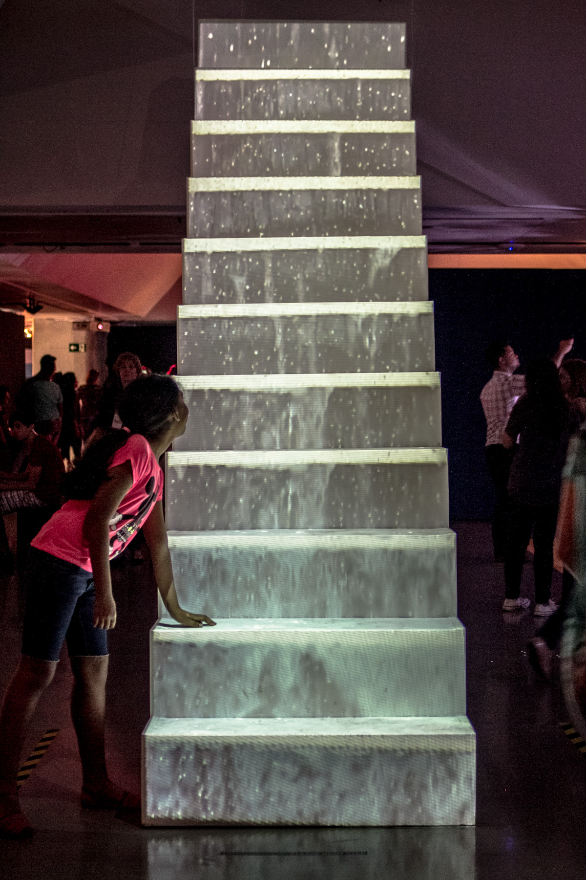 A projeção do deslizamento da água sobre a escada desafia o espectador, criando um jogo entre a ausência e a presença. Ausência da água que não está propriamente ali, mas aparece apenas representada através de uma sucessão de imagens. A água que hoje existe, mas poderá não existir amanhã, convertendo-se em uma dupla metáfora do presente e do futuro. A imagem em movimento nos mostra o mal-uso da água exageradamente ensaboada em um vazamento constante. Dando espaço a uma discussão contemporânea que é a preservação ambiental, no caso específico, o uso e escassez da água.