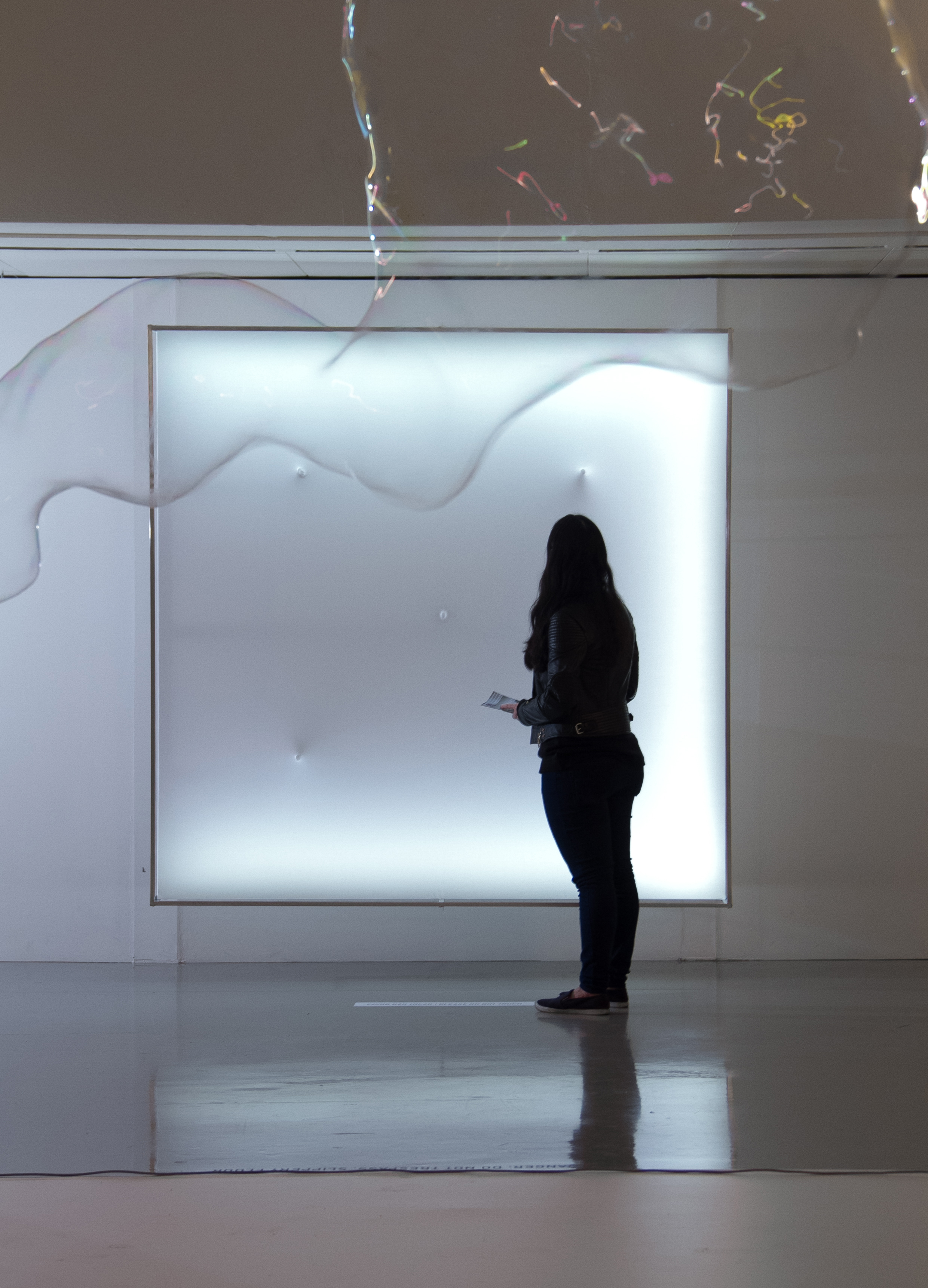 Quando a instalação chega ao estado de interpretação, todo o espaço muda para a escuridão e a superfície é iluminada por quatro fontes de luz dispostas ao redor da instalação. Derivadas das várias visões, compreensões e pré-aprendizagens de um destinatário universal, a sequência e o brilho das fontes de luz seguem seus próprios princípios. Simultaneamente, a sequência dos caracteres permanece a mesma que no estado “declaração”, mas não pode mais ser percebida como caracteres puros. Através da mudança constante da luz, da deformação física da superfície e da consequente modificação da percepção, a declaração original agora precisa ser interpretada pelo observador.