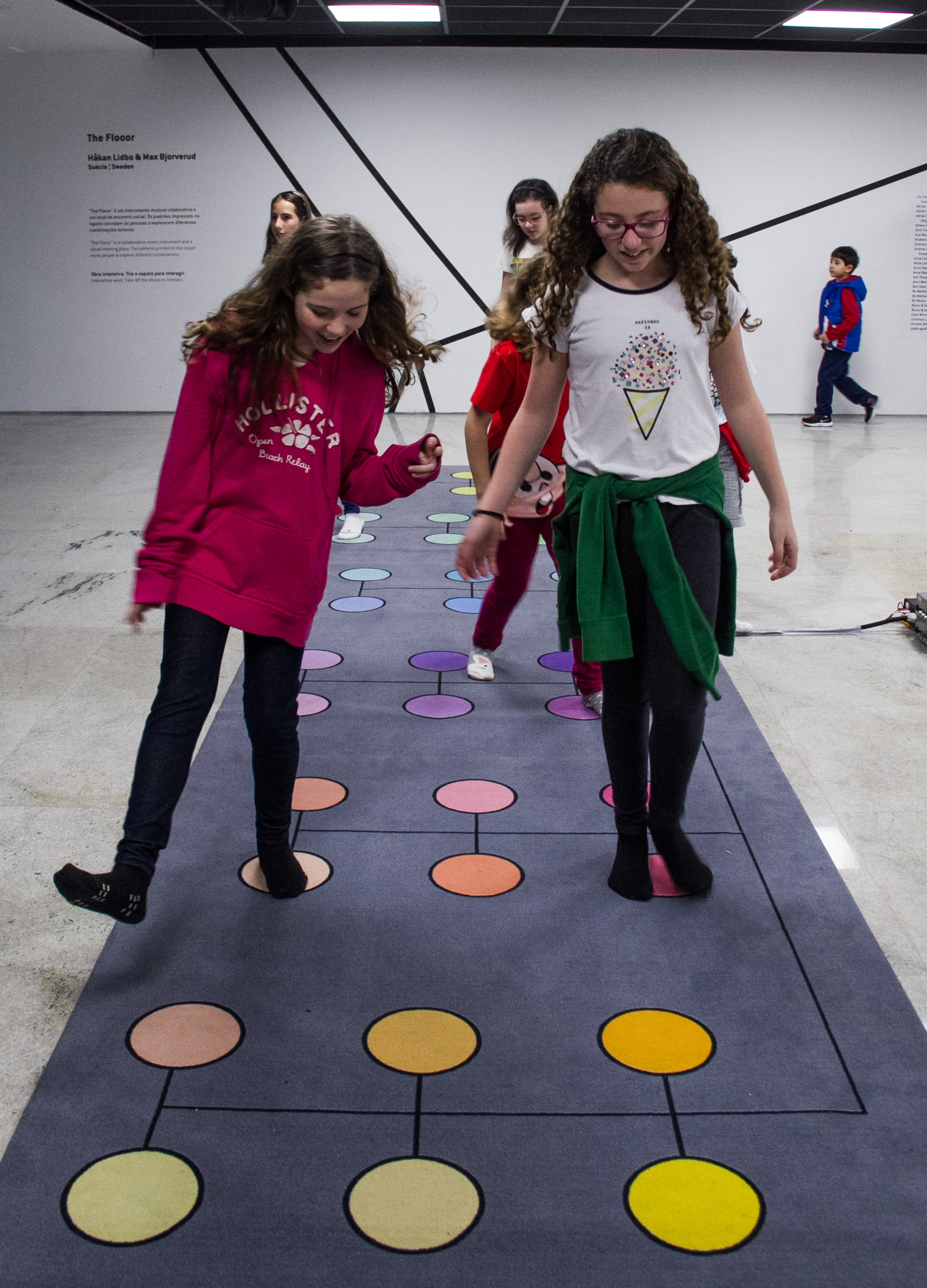 “The Flooor” é um instrumento musical colaborativo e um local de encontro social. Trinta e seis sensores sob um tapete, conectados a um computador musical montado debaixo do piso e alto-falantes montados no teto.