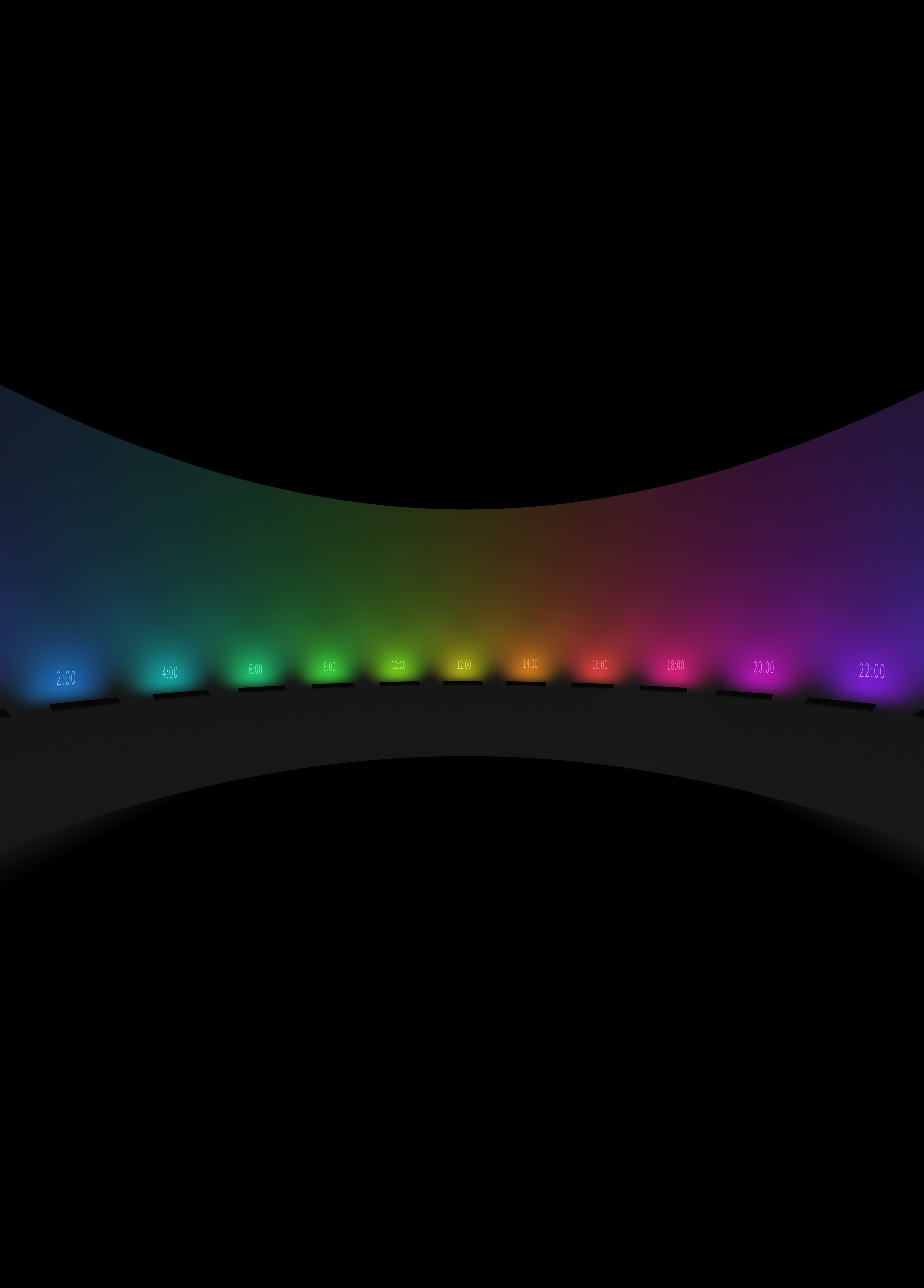 ‘Tempo: cor’ consiste em uma instalação imersiva que busca modificar nossa experiência do tempo através da conversão das horas em cores. Um conjunto de relógios cromáticos, cada qual ajustado para um fuso horário GMT diferente, projeta, em um semicírculo, a hora atual em suas representações matemática e cromática. A conversão entre essas duas formas de representação do tempo é baseada em um algoritmo composto por funções senoidais que modulam as cores RGB em função da hora atual, modificando gradativamente, ao longo do dia, as intensidades de azul, verde e vermelho: ao meio-dia predomina o amarelo, enquanto às quatro da tarde a hora é vermelha; a meia-noite é azul e as seis da manhã correspondem ao horário verde. Lado a lado, as cores projetadas pelos relógios se fundem, criando uma experiência imersiva de um tempo contínuo e circular, entre os diferentes fusos horários, que atravessa todo o espectro cromático. A instalação é parte de uma série de trabalhos nos quais investigo as relações entre as notações e códigos humanos e a nossa experiência do espaço-tempo, buscando alterar as formas como o entendemos. Neste caso, os visitantes imergem em uma experiência espacial do tempo que provoca o questionamento de notações e de percepções que usualmente consideramos axiomáticas. A mudança na forma como representamos o tempo altera nossa forma de experiência do tempo?
