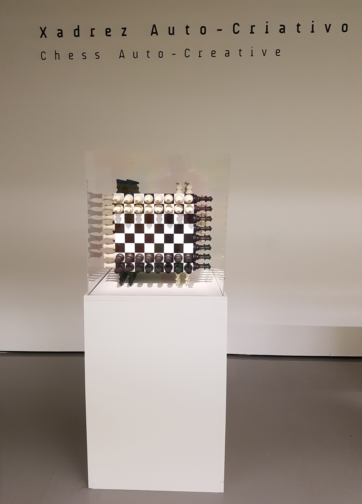 O ‘Xadrez Auto-Criativo (XAC)’ se apresenta na forma de um cubo onde cada uma das faces corresponde a um tabuleiro de xadrez 8×8; para uma melhor visibilidade, ele pode ser disposto numa versão linear, numa série sucessiva de seis tabuleiros. Em cada um destes tabuleiros existem 16 peças brancas e 16 peças pretas; formadas por: reis, rainhas, bispos, cavalos, torres e peões; que realizam seus movimentos oficiais; no entanto, ao invés de termos a disposição desta peças como em um jogo oficial de xadrez, elas são dispostas inicialmente pela repetição dos mesmos elementos, i.e: 16 reis brancos x 16 reis pretos; 16 rainhas brancas x 16 rainhas pretas; 16 cavalos brancos x 16 cavalos pretos e assim por diante. Os 6 primeiros jogos são chamados de ‘os 6 jogos primitivos’ ou “proto-xadrez”. Cada um deles tem um número romano: I, II, III, IV, V, VI; assim como coordenadas horizontais e verticais em notação algébricas: A, B, C, D, E, F, G, H x 1, 2, 3, 4, 5, 6, 7, 8. Cada posição algébrica de um tabuleiro tem sua correspondência nos outros 5 tabuleiros i.e: no tabuleiro I, a posição A1, corresponde, simultaneamente, a posição A1 nos tabuleiros II, III, IV, V e VI, ou seja, os lugares das permutações possíveis. Os tabuleiros são compostos por um total de 192 peças, sendo 96 brancas e 96 pretas. Cada tabuleiro, por sua vez, possui 16 peças brancas e 16 peças pretas. As 192 peças são permanentes e nunca saem dos tabuleiros, mas se permutam entre si. O ‘Xadrez Auto-Criativo’ pode gerar jogos simétricos ou assimétricos. Ele é simétrico quando as peças brancas estão dispostas com a mesma equivalência e posição que as peças negras; assim como ocorre no jogo oficial. Será assimétrico quando as peças não forem equivalente, nem em posição e nem em seus elementos; porém sempre mantendo o posicionamento das 16 casas para as brancas e 16 casas para as negras. como no jogo oficial. Cada vez que uma peça é deslocada, simetricamente ou assimetricamente, surge uma nova variação do ‘protoxadrez’ e portanto um novo jogo, todos os jogos gerados desta forma são, a princípio variações do ‘proto-xadrez’ inclusive o próprio jogo oficial do xadrez. Desta forma o ‘Xadrez Auto-Criativo’ não é uma variante do xadrez oficial, mas a sua origem. Os jogos de xadrez gerados pelo XAC podem ser simples ou complexos. Os jogos mais simples, são os ‘jogos primitivos’, apesar de jogáveis, não tem objetivo, ou pela ausência do rei ou pela inflação deste. Já os complexos envolvem estratégias mais elaboradas, como no caso do xadrez oficial, cujo o objetivo é imobilizar o rei do adversário. Por jogos complexos se entende aqueles que são mais problemáticos e não dependem da sorte, onde as dificuldades e os obstáculos são mais difíceis de serem superados e os objetivos exigem inteligência para serem alcançados. Através do ‘Xadrez Auto-Criativo’ as pessoas poderão encontrar, selecionar e desenvolver novos jogos e novas jogadas.