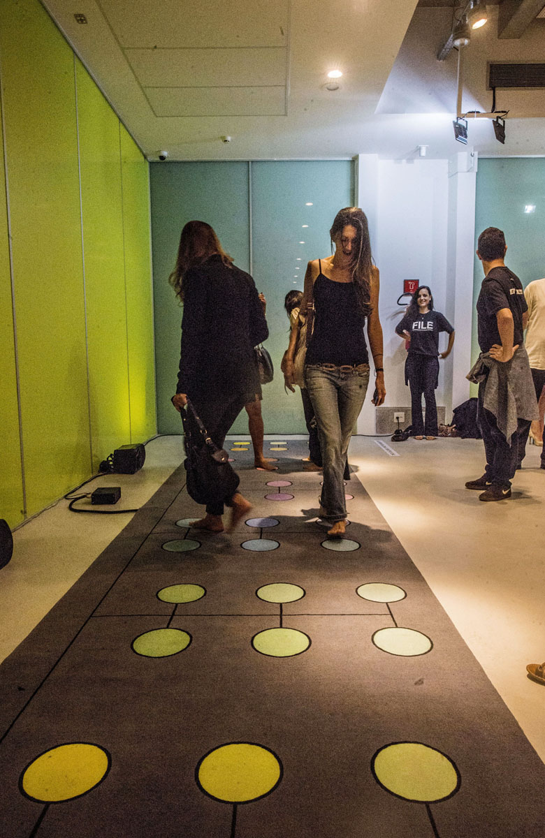 “The Flooor” é um instrumento musical colaborativo e um local de encontro social. Trinta e seis sensores sob um tapete, conectados a um computador musical montado debaixo do piso e alto-falantes montados no teto.