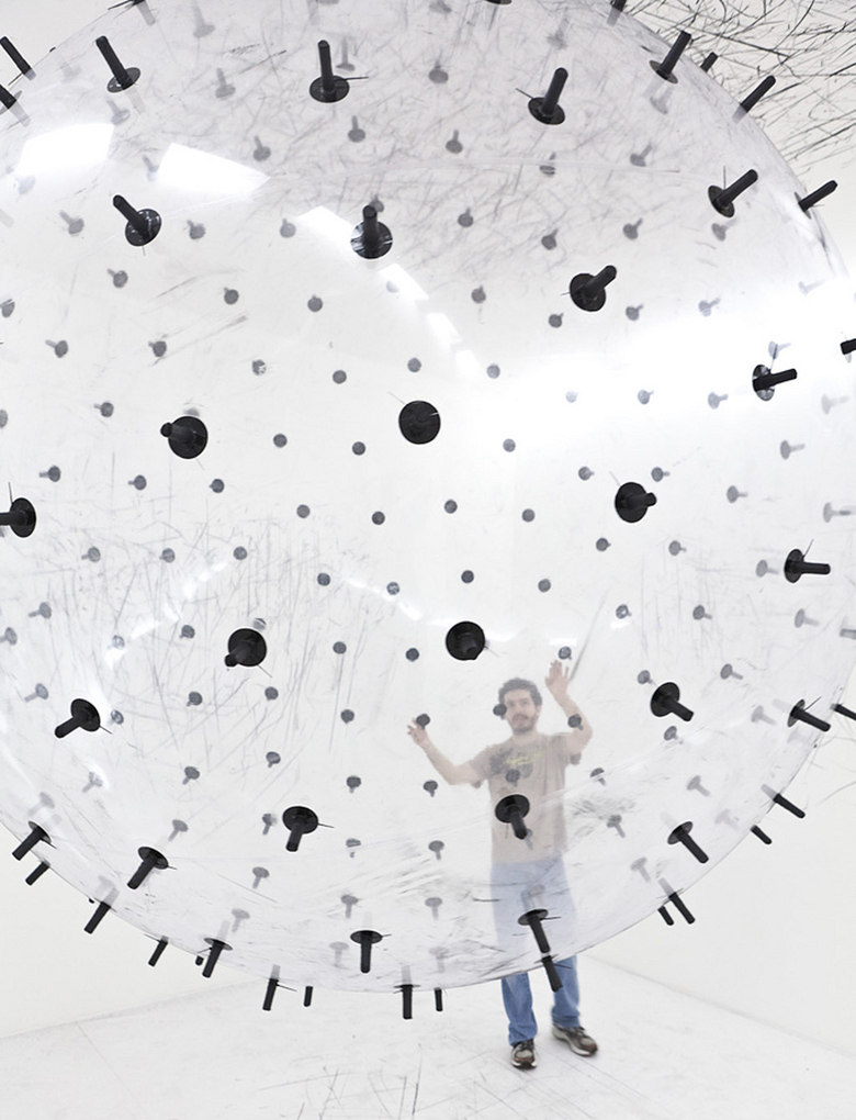 Semelhante à “Méta-Matics” de Tinguely, “ADA” é uma obra de arte com alma. Ela se interpreta. Em Tinguely, basta ser uma entidade mecânica lutando inconscientemente. Ele levou a coisa de maneira bem humorada: a máquina produz apenas sua autodestruição industrial. Enquanto “ADA”, de Karina Smigla-Bobinski, é uma “criatura” pós-industrial, animada pelo visitante, uma escultura-artista que atua criativamente, uma obra de arte autoinformante, que se assemelha a um híbrido molecular, como da nanobiotecnologia. Ela desenvolve os mesmos híbridos rotativos de carbono-silício, ferramentas anãs, máquinas miniaturas capazes de gerar estruturas simples. “ADA” é muito maior, esteticamente muito mais complexa, uma máquina de fazer arte interativa. Cheio de hélio, flutuando livremente na sala, um globo transparente parecido com uma membrana, com pontas de carvão que deixam marcas nas paredes, teto e piso. Marcas que “ADA” produz de modo autônomo, embora movida pelo visitante. O globo obtém uma aura de vivacidade e seus traços de carvão preto, a aparência de um desenho. O globo colocado em ação fabrica uma composição de linhas e pontos que permanecem incalculáveis em sua intensidade, expressão, forma, por mais que o visitante tente controlar “ADA”, conduzi-la, domesticá-la. Qualquer coisa que ele tente, perceberá muito cedo que “ADA” é uma performer independente, marcando as paredes originalmente brancas com desenhos e signos. Surgem estruturas de textura cada vez mais complexas. É um movimento experimentado visualmente, que como um computador faz uma produção imprevisível depois da entrada de um comando. Não por acaso, “ADA” lembra Ada Lovelace, que no século 19, juntamente com Charles Babbage, desenvolveu o primeiro protótipo de computador. Babbage forneceu a máquina de computação preliminar, Lovelace o primeiro software. Uma simbiose de matemática com o legado romântico de seu pai, Lorde Byron, surgiu ali. Ada Lovelace tentou criar uma máquina que seria capaz de criar obras de arte como poesia, música ou imagens, como um artista. “ADA” de Karina Smigla-Bobinski se situa nessa mesma tradição, assim como na de Vannevar Bush, que construiu uma máquina Memex (Memory Index) em 1930 (“Queríamos que o memex se comportasse como a rede intricada de traços transportados pelas células do cérebro”), ou o tear de Jacquard, que para tecer flores e folhas precisava de um cartão perfurado; ou a “máquina analítica” de Babbage, que extraiu padrões algorítmicos. “ADA” surgiu no espírito atual da biotecnologia. Ela é uma máquina de performance vital, e seus padrões de linhas e pontos ficam cada vez mais complexos conforme o número de espectadores-atores aumenta. Deixando traços que nem a artista nem os visitantes são capazes de decifrar, para não falar na própria “ADA”. Ainda assim, o trabalho de “ADA” tem inconfundivelmente um potencial humano, porque o único método de decodificação disponível para esses signos e desenhos é a associação que nosso cérebro corresponde ao máximo quando dorme: a truculenta vivacidade de nossos sonhos.